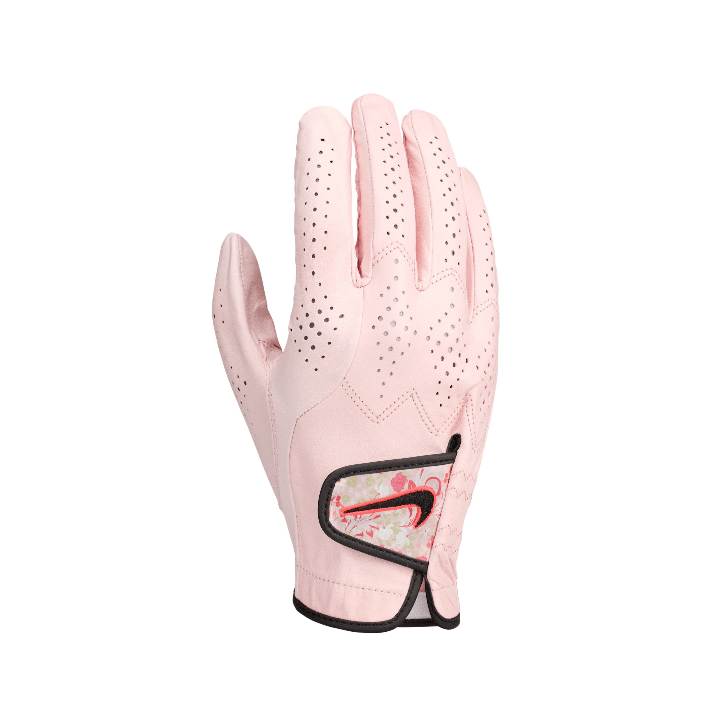 Show out in your Sunday best with the Nike Tour Classic 4 glove. Made with soft leather and more perforations than previous versions, this durable glove helps keep you cool and comfortable through 18 and beyond. Benefits:Premium leather provides a soft feel and excellent fit, grip and durability. Perforations and stretchy material zones optimize breathability and flexibility. Angled tab closure lets you customize your fit. [] Product Details:Palm:100% sheepskin leather. Back:61% goatskin leather/32% sheepskin leather/7% nylon. Other:63% goatskin leather/22% PU leather/15% nylon. Hand wash. Imported. Style: N1013748; Color: Pink Bloom; Size: S; Gender: Female; Age Group: Adult | Nike Tour Classic 4 Women's Golf Glove (Right Regular) in Pink, Size: Small | N1013748-652