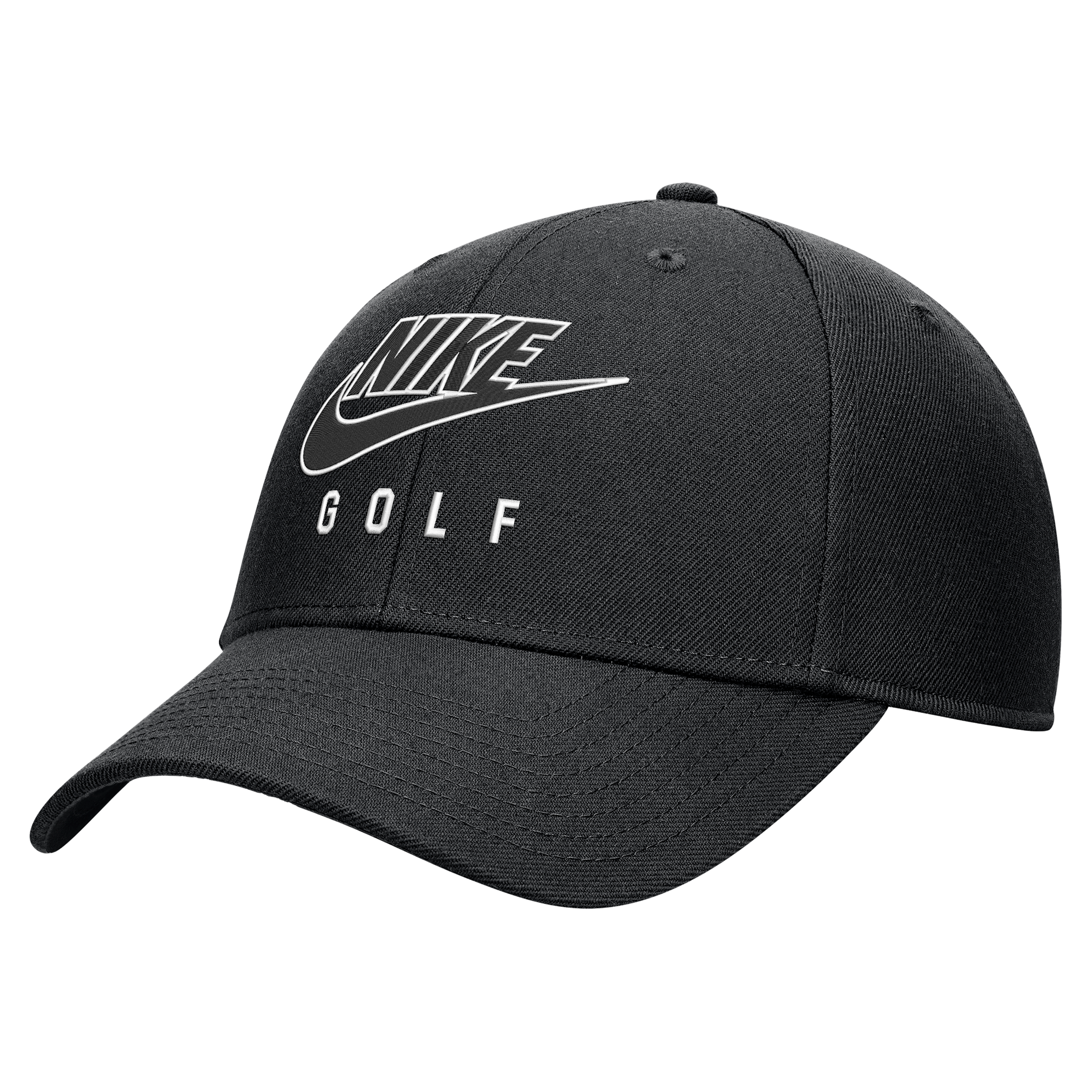 Top off your look with the game you love. This structured cap features ripstop, sweat-wicking fabric. Benefits:Nike Dri-FIT technology moves sweat away from your skin for quicker evaporation, helping you stay dry and comfortable. Adjustable closure helps ensure the right fit. [] Product Details:100% polyester. Hand wash. Imported. Style: C11451GO014; Color: Black; Size: M/L; Gender: Unisex; Age Group: Adult | Nike Club Structured Dri-FIT Golf Futura Swoosh Cap in Black, Size: M/L | C11451GO014-00A