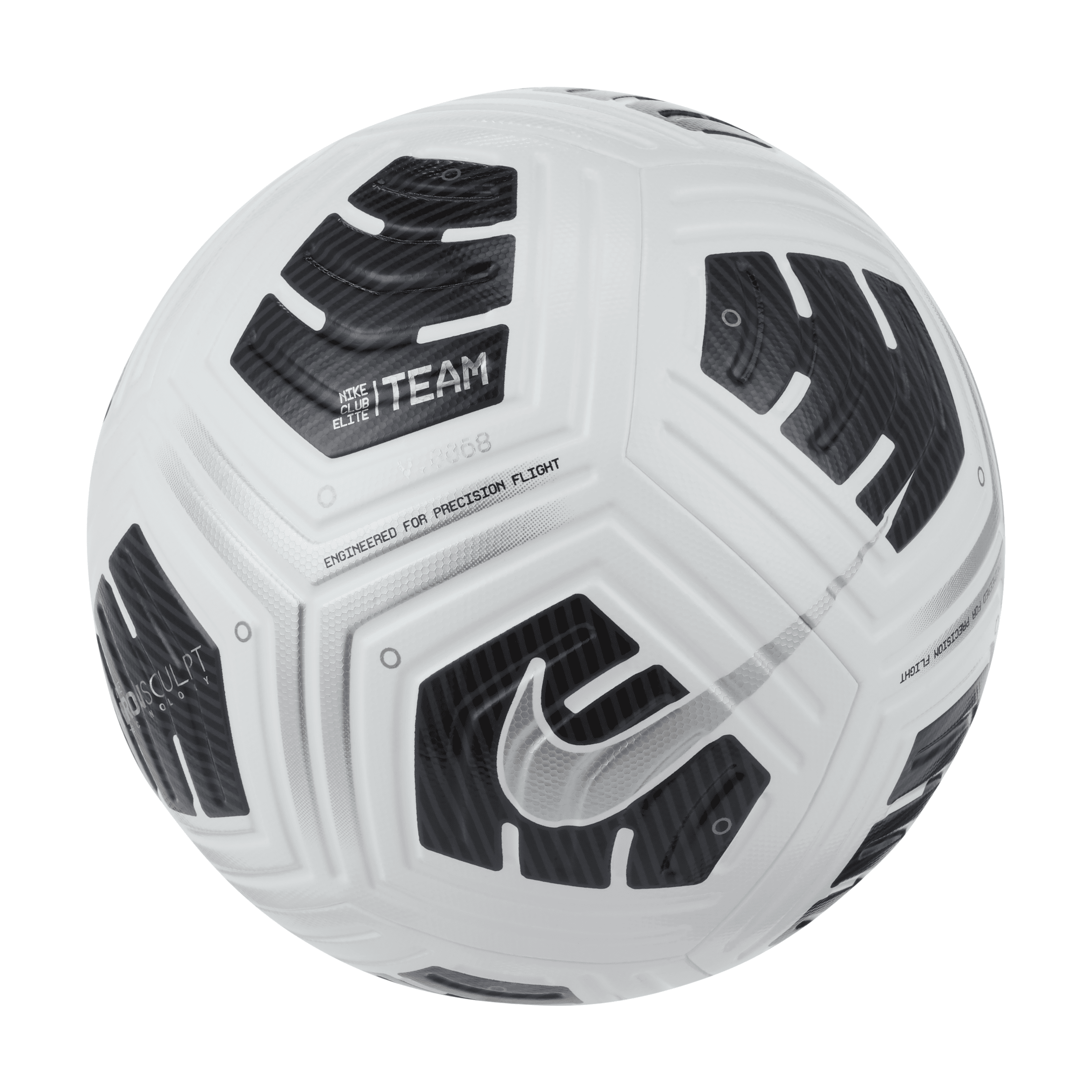 CONSISTENT FLIGHT ACROSS THE PITCH. The Nike Club Elite Team Soccer Ball is ready to fly into the back of the net. A textured casing with stabilizing grooves gives you consistent touch when passing, shooting and dribbling. Benefits:Nike Aerowsculpt technology uses molded grooves for more consistent flight. Textured casing gives you great touch and feel. Rubber bladder helps maintain air pressure and shape. [] Product Details:40% rubber/40% synthetic leather/15% synthetic/5% cotton. Imported. Style: CU8053; Color: White/Black/Metallic Silver; Size: 5; Gender: Unisex; Age Group: Adult | Nike Club Elite Team Soccer Ball in White, Size: 5 | CU8053-100