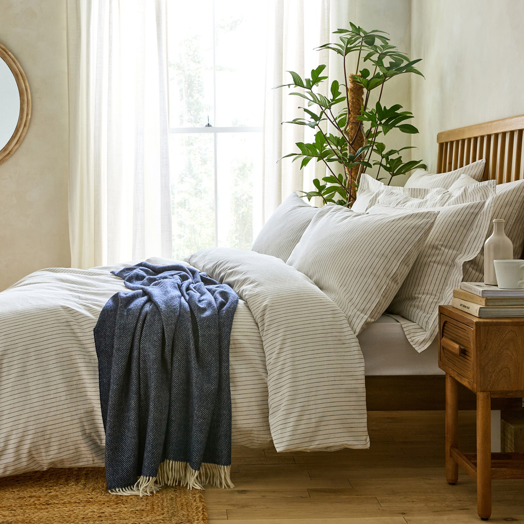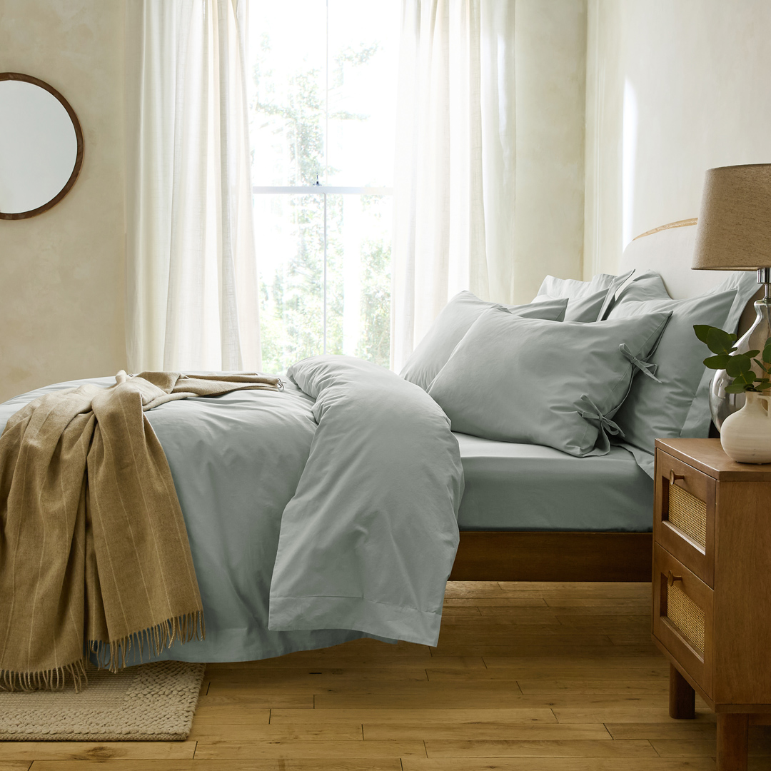 For those "in the know," Soprano sheets and Peacock Alley are almost synonymous. It has been a part of our line for decades because of its supreme quality and buttery soft feel. Complete your bed with our Soprano sateen duvet available in a variety of neutrals to complement your style. Available in a duvet cover, shams, bed skirts, flat sheets, fitted sheets, pillowcases and as a sheet set. 100% Long staple cotton 420 Thread count sateen sheeting Duvet cover is constructed with a 4" flange on three sides with a knife edge finish at the top and a button closure on the back. Imported from Portugal Shams sold separately Dimensions Twin/Twin XL - 68" x 90"Full/Queen - 90" x 90"King/Cal King - 105" x 90" Care Machine wash cold, gentle cycle. Do not mix colors, do not bleach or use fabric softener. Tumble dry low, remove promptly. Warm iron, if needed. May be professionally cleaned. All natural fibers will shrink to some extent. You can expect about 3% shrinkage with cotton. To minimize shrinkage avoid hot water washing and high heat drying. Product Certification Standard 100 by OEKO-TEX® Certified Toxin-free and made to the highest standard, every component of this product complies with the rigorous OEKO-TEX® standards that test for harmful substances and textile safety. Learn More | Peacock Alley Soprano Sateen Duvet Cover in Blue | Full/Queen | 420 Thread Count | 100% Combed long Staple Cotton Percale