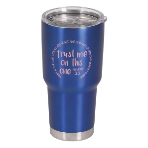 Super Sized To Hold 30 Ounces. Made Of High Quality 18/8 Stainless Steel Inside And Out, So Hot Drinks Stay Hot And Cold Drinks Stay Cold. Attractive Blue Finish On The Outside. Clear Heavy Duty Plastic Lid Includes Silicone Sealing Ring To Reduce Spills, Plus A Sliding Mechanism At Top That Easily Opens Or Closes The Drink Opening. Tumbler Size Is 8 Tall; 3-3/4 Diameter At Top. To Care For Tumbler, Hand Wash Only And Do Not Microwave. Tumbler Features Text: Trust Me On This One; Along With Proverbs 3:5: Trust In The Lord With All Your Heart And Lean Not On Your Own Understanding.