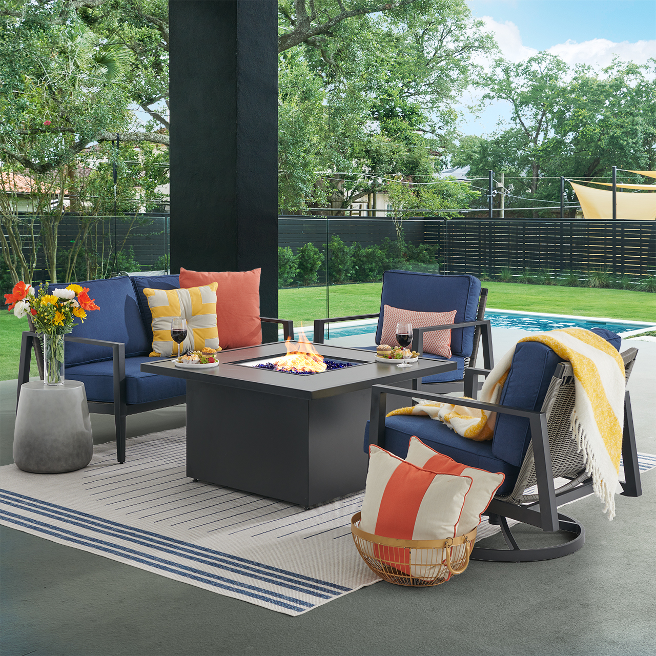 The Portofino Collection features a bold and modern look that will provide you with the perfect backyard patio experience. It is built for long-lasting durability. Each piece in this 4 piece swivel loveseat group has an extruded aluminum frame with weather-resistant properties such as a powder-coated and hand-applied antique finish with UV inhibitors. The loveseat and swivel club chairs feature a handwoven synthetic resin wicker seat and back with deluxe Sunbrella solution-dyed acrylic cushions to create a relaxed and comfortable experience.Stay comfortable no matter the temperature outside with this 42 in. square sintered stone table top fire pit. The seamless stone top will impress and add a unique flair to your seating group, even on the coolest nights. Included is a fire pit lid to cover your fire pit when not in use.What's Included: 1 - Loveseat with Cushions: 54.33 in. L x 35.04 in. D x 30.91 in. H 2 - Swivel Club Chairs with Cushions: 29.13 in. L x 35.04 in. D x 30.91 in. H 1 - Sintered Stone Top LP Gas Fire Pit Table: 42 in. D x 24 in. HFeatures: - Extruded aluminum frames - UV-resistant, powder-coated finish with hand-applied topcoat - Handwoven synthetic resin wicker seatingFire Pit Features: - Powder-coated aluminum frame - Seamless sintered stone table top - Wonder Fire CSA Certified - Includes a fire pit lid- Fuel type: Gas - Ignition type: Manual - 55k BTU - LP tank not included - Natural Gas conversion kit sold separatelyCushion: - 100% solution-dyed acrylic Sunbrella fabric - UV resistant, fade resistant, mold and mildew resistant, spill-proof and stain resistant - Seat cushions use a plush polyester that is wrapped over a foam core which provides a lasting structure and softness. - Back cushions use a layered, softer grade and more expensive polyester for added comfort.