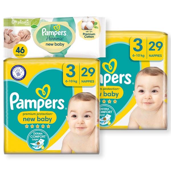Online Only Bundle containing New Born Nappies Size 3 & Pack of Harmonie New Baby Plastic Free WipesIncluded in this bundle:New Baby size 3 carry pack 29Wrap your baby in Pampers Premium Protection Pampers' softest comfort and unbeatable skin protection the only newborn nappies approved by the British Skin Foundation.Wrap your baby in Pampers Premium Protection Pampers' softest comfort and unbeatable skin protection the only newborn nappies approved by the British Skin Foundation.22838281838281Harmonie New Baby WipesHarmonie New Baby WipesSpecially designed for newborns. Contain a unique smooth lotion to restore newborn's natural skin pH protecting from irritation. Made with 100% plant-based fibres. Made with 0% alcohol and perfume. Approved by Skin Health Alliance dermatologists. 0% plastic.