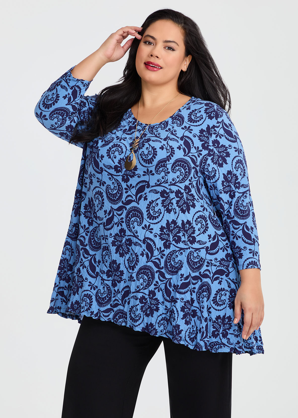 Brighten your wardrobe with the Peplum Luna Top from Taking Shape, perfect for brunches and garden parties. Made from smooth, stretchy fabric, this top offers incredible comfort while showcasing a stunning warm paisley print. Its flattering round neckline and stylish 3/4 sleeves enhance your silhouette, while the crushed fabric adds a touch of sophistication. Designed for plus size fashionistas, this peplum top celebrates your curves beautifully. Pair it with tailored trousers or your favourite jeans, and enjoy effortless style and confidence anywhere you go.