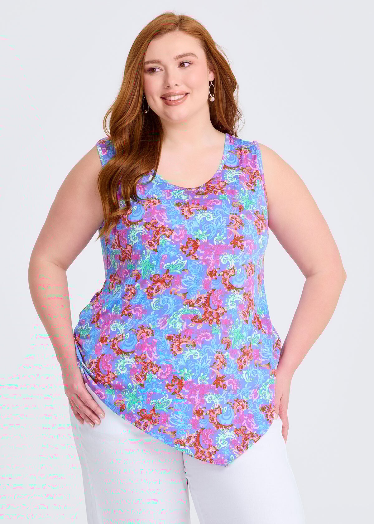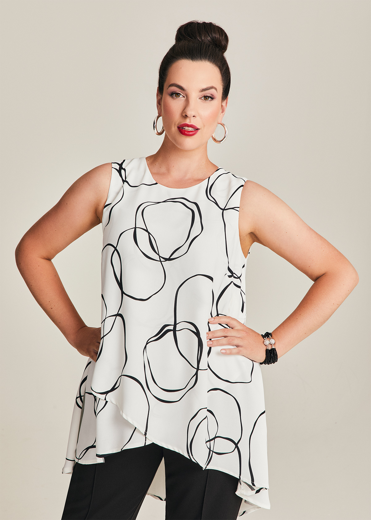 "To celebrate four decades of fabulous fashion, we're bringing back the iconic designs that you've helped make famous. Let's party!"Elevate your wardrobe with the Colby Sleeveless Long Tunic from Taking Shape, featuring a stunning abstract print that blends style and comfort. Its flattering longline silhouette and asymmetrical Hi-lo hemline add playful elegance. The round neckline and bust darts ensure a tailored fit, while the back split offers a hint of flirtiness, perfect for day-to-night wear. Pair it with leggings or tailored pants for versatile sophistication. Embrace your unique style with this striking tunic that promises to turn heads.