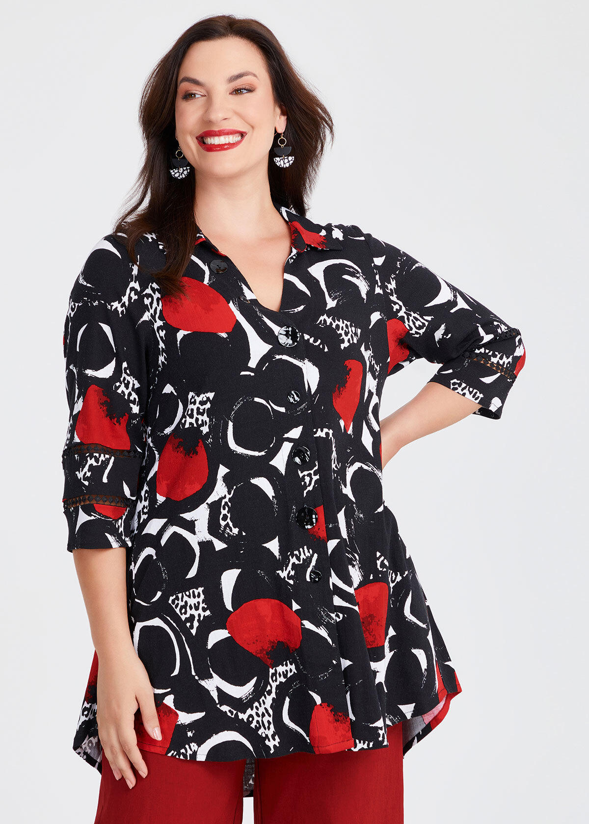 Elevate your plus size wardrobe with the Spot Swing Natural Shirt from Taking Shape, a piece that effortlessly combines artful design with everyday comfort. Imagine strolling through a contemporary gallery, the soft and stretchy viscose blend caressing your curves, while the vibrant geometric circles print captivates every gaze. With hidden pockets for those little essentials and delicate crochet trim details, this shirt marries functionality with flair. The button-through front and classic collar make it an easy choice for a chic ladies lunch.