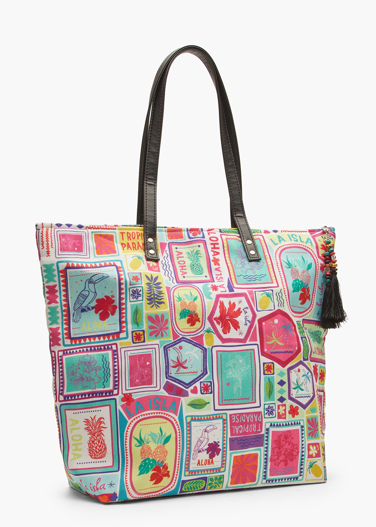 Brighten your day with the Bright Stamps Tote Bag from Taking Shape! This spacious bag features a vibrant stamps print that adds personality to any outfit. It includes a secure top zip closure and an internal pocket for your phone, making it practical for any outing. The chic jeweled tassel and fully lined polyester bring style and functionality together.