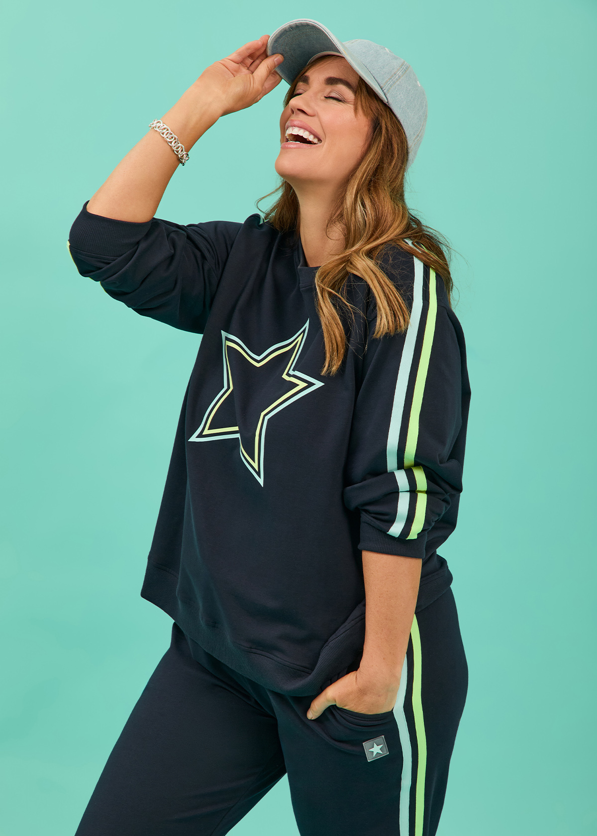 Ignite your laid-back style with the Cotton Stripe Star Sweatshirt—, a must-have for cosy weekends spent with friends or relaxed evenings at home. This vibrant long-sleeve sweatshirt features a playful printed star design at the front, perfectly complemented by a chic contrast colour tape detail on the sleeves that gives it a modern touch. Crafted with care, the soft cotton fabric envelops you comfortably, while the ribbed cuffs, neckline, and hemline ensure a flattering fit that beautifully accentuates your curves. Ideal for plus size fashionistas who refuse to compromise style, this piece effortlessly balances chic and comfort, making it your new go-to for layering or lounging.