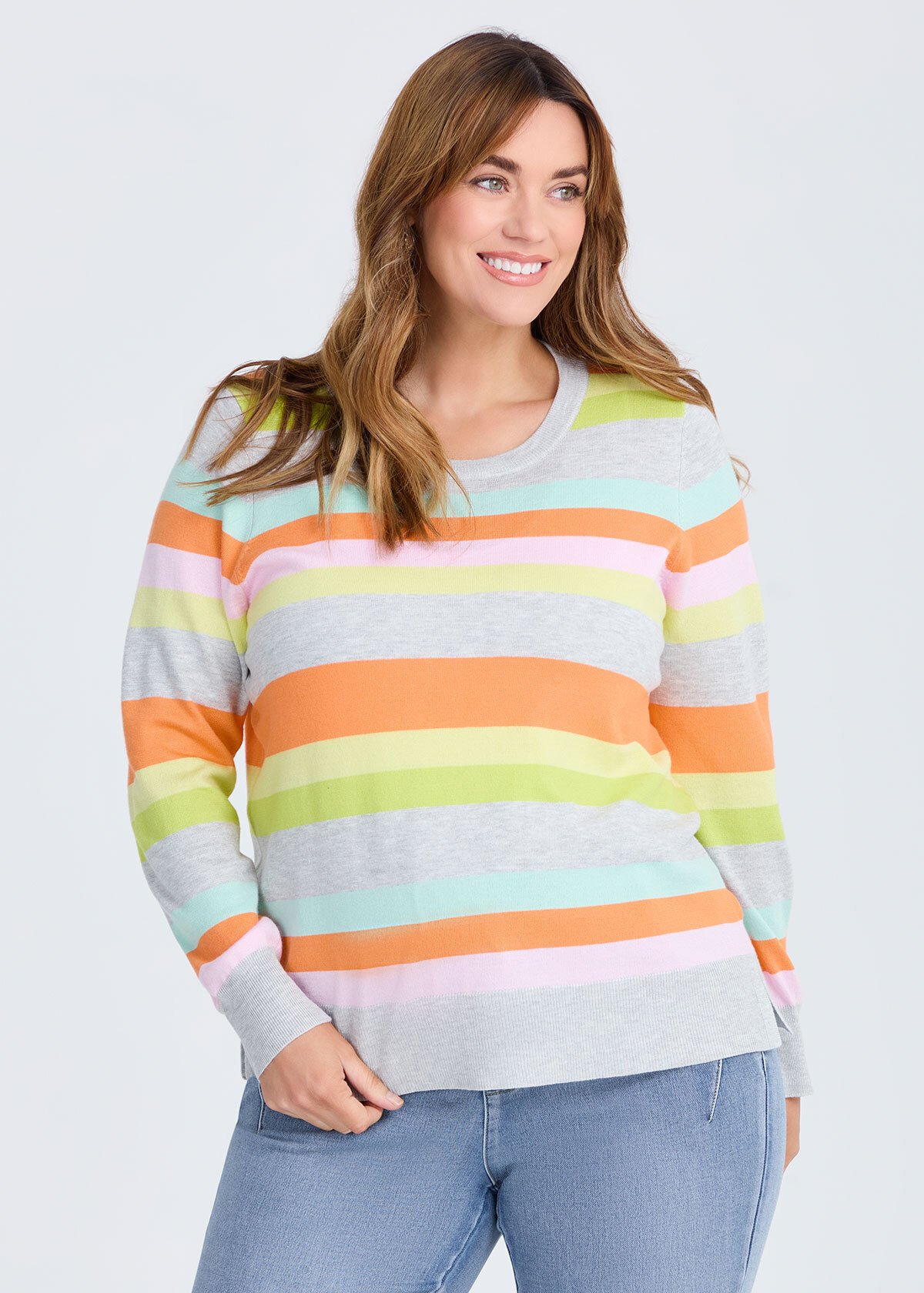 Embrace a burst of joy with the Bamboo Sorbet Stripe Jumper from Taking Shape, your go-to companion for breezy weekend brunches or casual strolls in the park. This stunning multi-stripe jumper, drenched in delightful sorbet colours, effortlessly blends style with comfort. Its long sleeves and flattering round neckline provide just the right amount of coverage, while the playful side seam splits add a touch of modern flair. Designed with ribbed cuffs and a chic hemline, it embraces your curves beautifully, ensuring you feel confident and fabulous at any size. Crafted from sustainable bamboo blend fabric, this jumper makes a fashion statement and champions eco-friendly living.