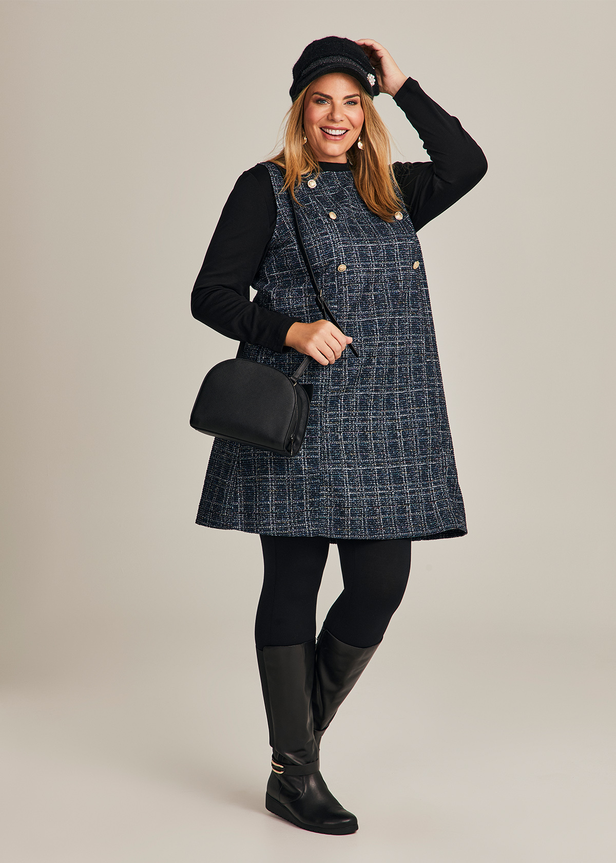 Elevate your plus size wardrobe with the Boucle Button Shift Dress from Taking ShapeÑan enchanting blend of elegance and comfort that's perfect for capturing hearts on a romantic evening or breezy weekend getaway. This eye-catching midi dress features a flattering round neckline and stylish sleeveless design, elegantly crafted from luxurious boucle fabric that drapes gracefully. The front design lines are adorned with unique specialty buttons, adding a touch of playful sophistication, while the discreet side pockets offer practicality without sacrificing style.