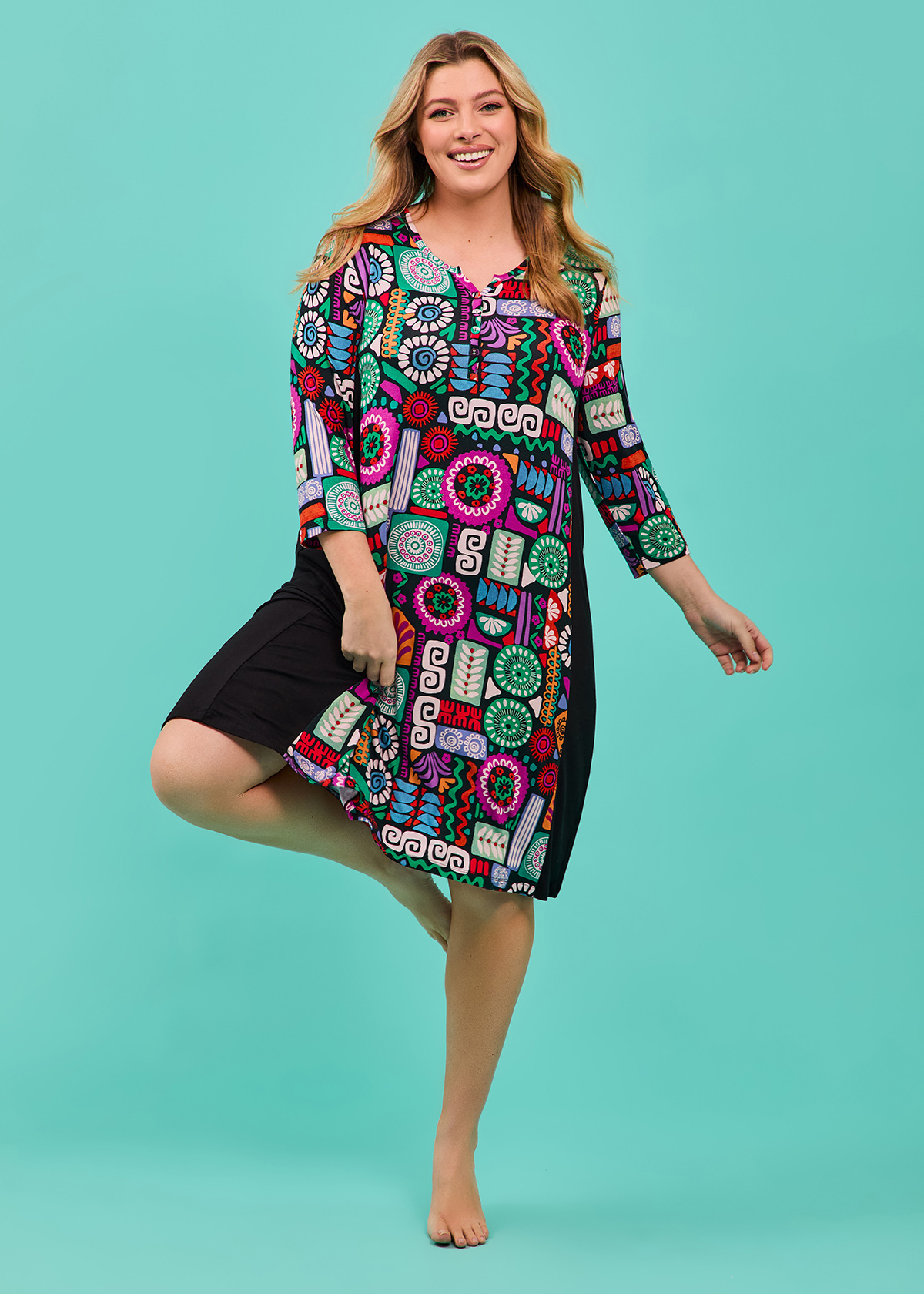 Embrace a dreamy night of comfort and style in the Bamboo Fun Print Placket Nightie by Taking Shape, where playful elegance meets effortless loungewear. Featuring a flattering V neckline and charming half button opening, this delightful nightie showcases your unique flair with its exclusive, vibrant printdesigned to turn heads even during the coziest evenings. The sleek side black panels effortlessly accentuate your curves while providing a chic contrast to the lively colours, making it a must-have for plus size fashionistas who refuse to compromise style. Crafted from soft, breathable bamboo fabric, this nightie promises to wrap you in luxurious comfort, whether enjoying a quiet night or hosting a spontaneous Pyjama party with friends.