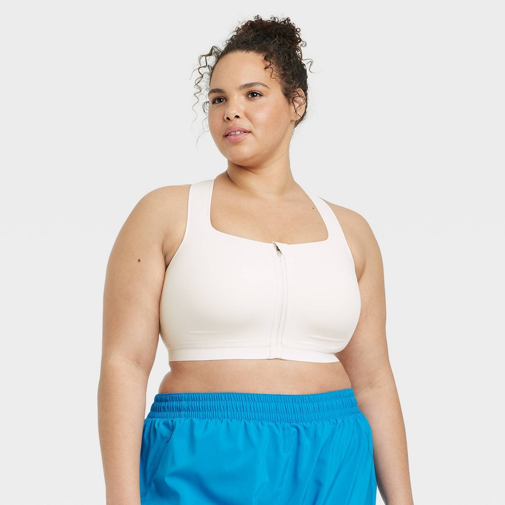 Why we're ALL IN: Solid-color sports bra with a zip-up front. Provides maximum support suitable for high-intensity workouts. Soft, stretchy fabric with moisture-wicking properties helps keep you dry and cool while exercising. Sculpted front with molded cups, wide shoulder straps, a crisscross back with adjustable straps for a personalized fit. All in Motion™: Made for every move, priced for every day. Sports Bra Guide: featuring moisture-wicking, quick-dry performance in a range of styles, lengths, cup options & supports. 1. Light Support: made for low impact workouts like yoga, hiking, and stretching. Lengths: classic & long line. Fabrics: Everyday Soft, Flex. 2. Medium Support: made for medium impact workouts like spin or studio classes. Lengths: classic & long line. Fabrics: Everyday Soft, Seamless, Effortless Support. 3. High Support: made for high intensity workouts like running, kickboxing, or cross training. Lengths: classic. Fabrics: Sculpt.