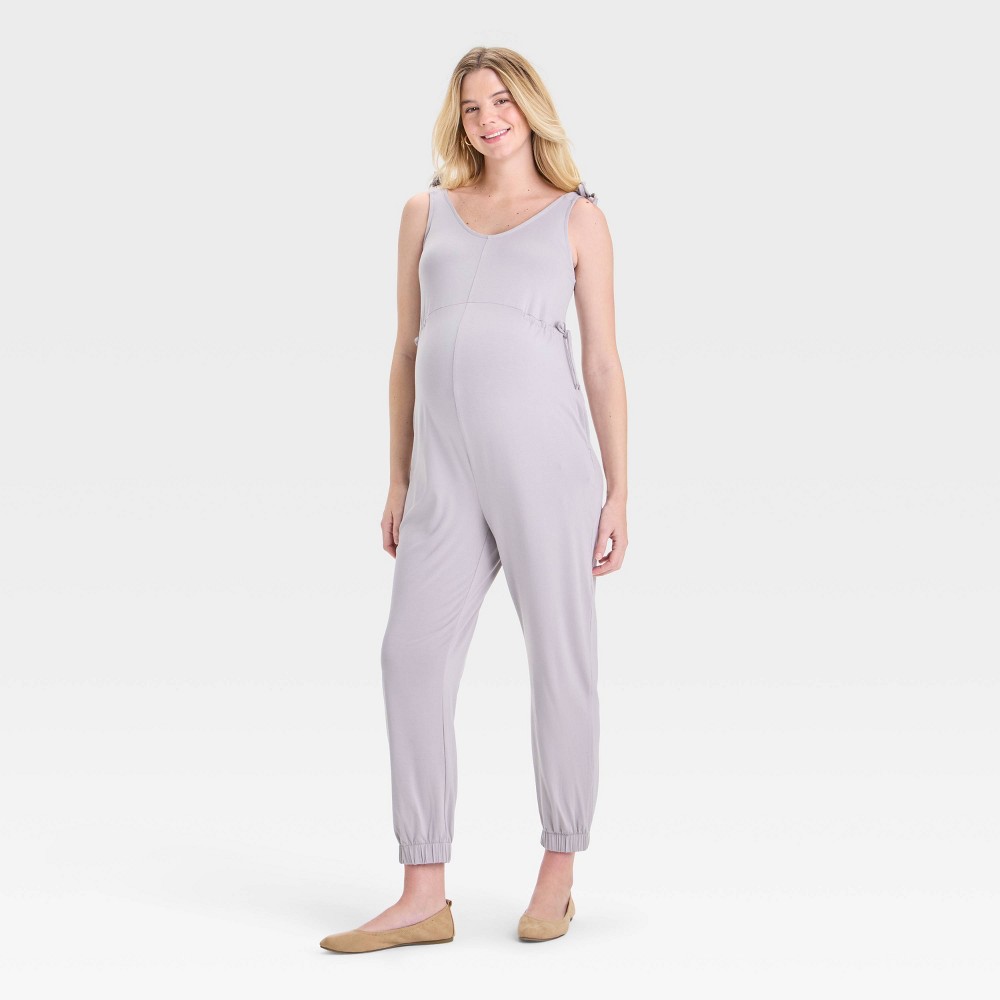 Keep your pregnancy looks comfy and stylish with this Knit Maternity Jumpsuit from Isabel Maternity by Ingrid & Isabel™. The V-neckline maternity jumpsuit features tie-detailing on the straps and waist with elastic design for a figure-flattering look, along with elastic cuffs for a snug fit. The soft knitted fabric with added spandex offers stretchy comfort, while side pocket lends functional detail. Pair with your choice of footwear and accessories to complete the look.