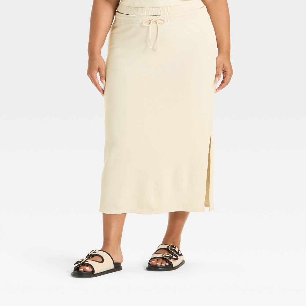 Feel fantastic and stylish in this Leisure Studio French Terry Midi Pencil Skirt from Universal Thread™. Made of cotton-modal blend ribbed fabric, this regular-rise pencil skirt provides all-day comfort. Designed with an adjustable waistband with a drawstring closure for a snug fit, this midi shirt comes with a side slit for added flair. Pair it with your choice of tops and footwear to complete the chic look. Universal Thread™: Found exclusively at Target. Scan the care tag QR code to follow the journey of your item—materials, care, styling, resale & more—through the digital product passport.