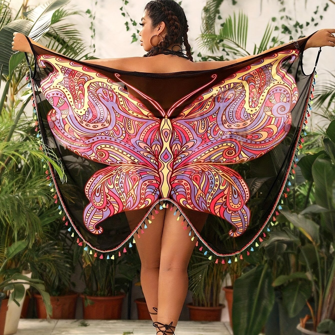 TEMU Chic Print Pom Pom Trim Beach Wrap - Semi-she...