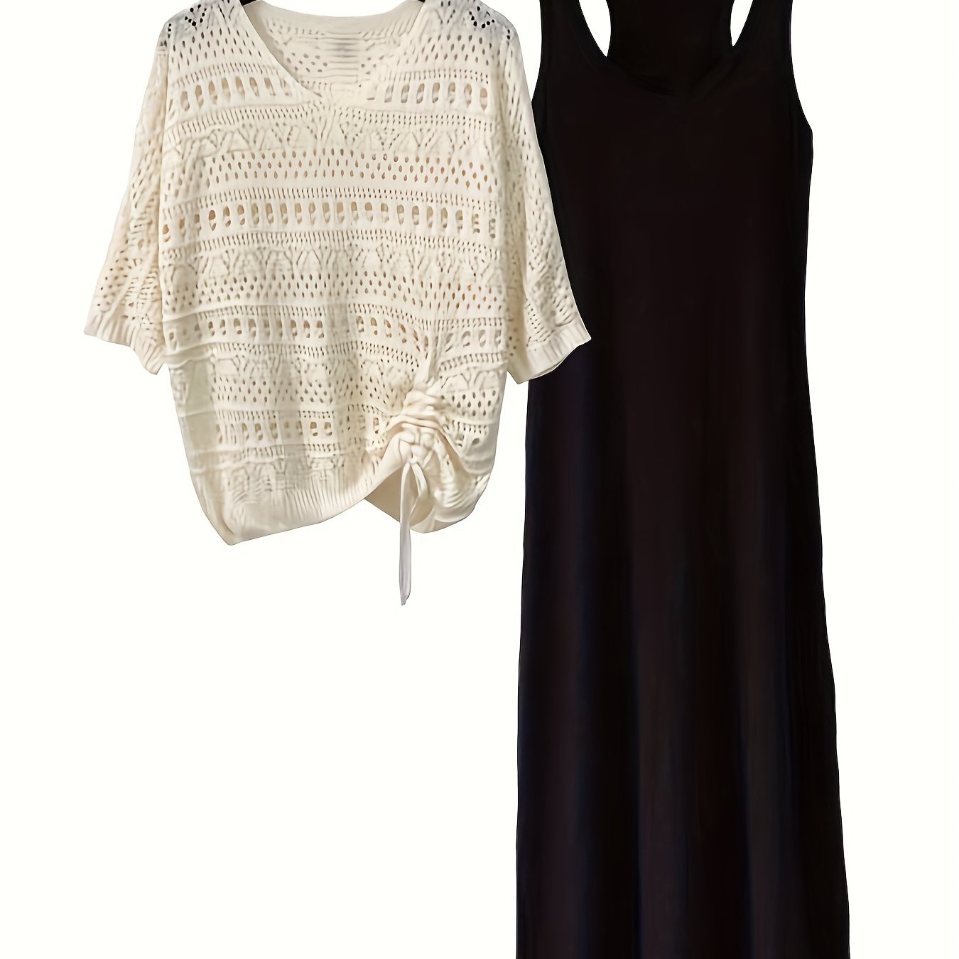 TEMU 新作レディースファッション ホローツーピースセット 薄手バットスリーブホールシャツドレスセ...