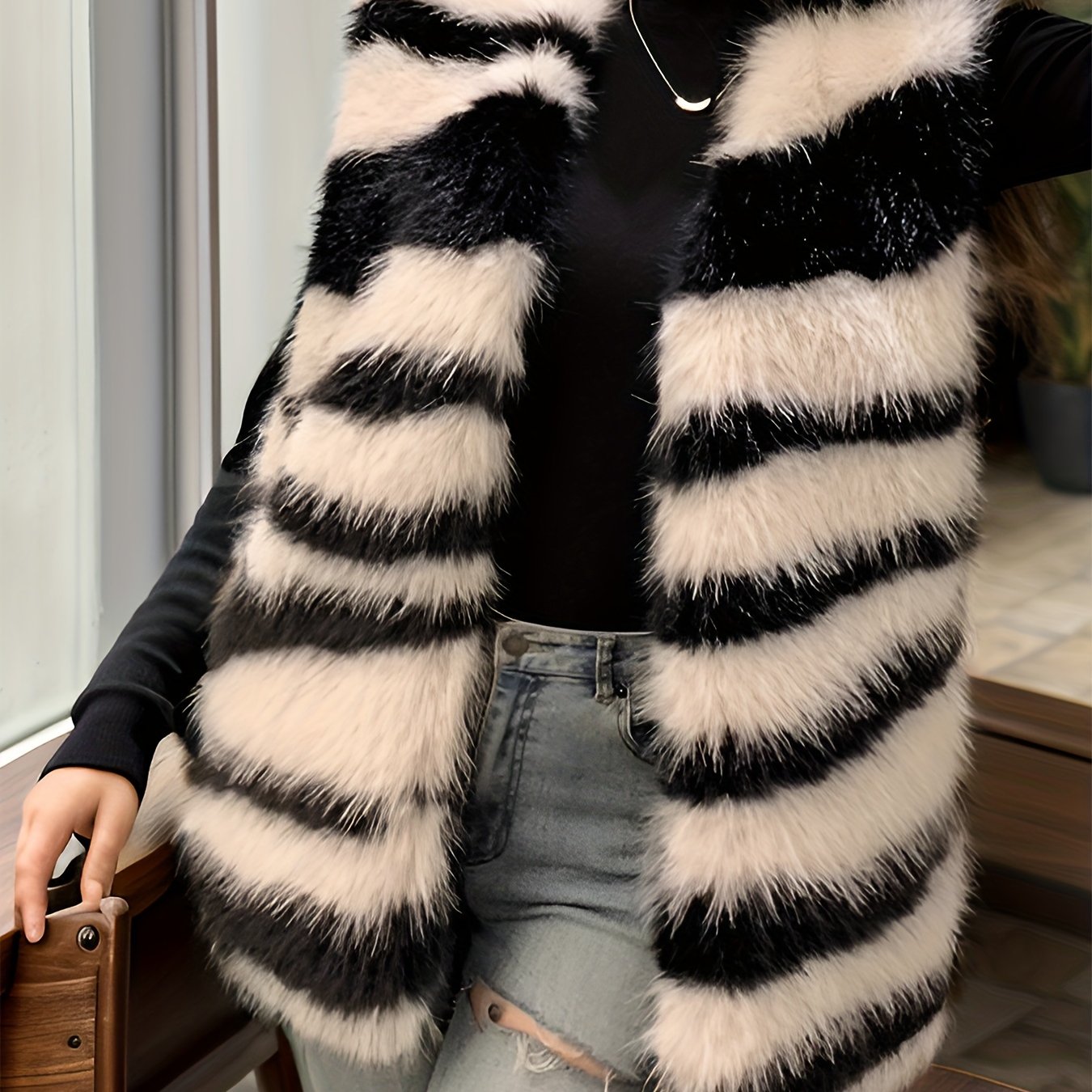 TEMU Abstract Pattern Fuzzy Vest, Elegant Open Fro...
