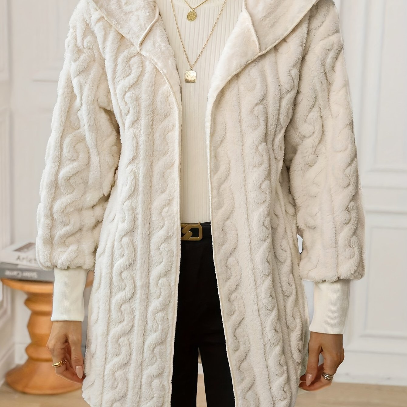 TEMU Women's Elegant Cream Hooded Fleece Coat - So...