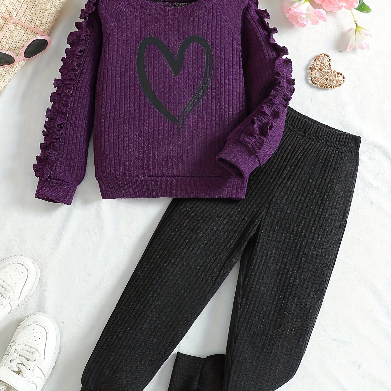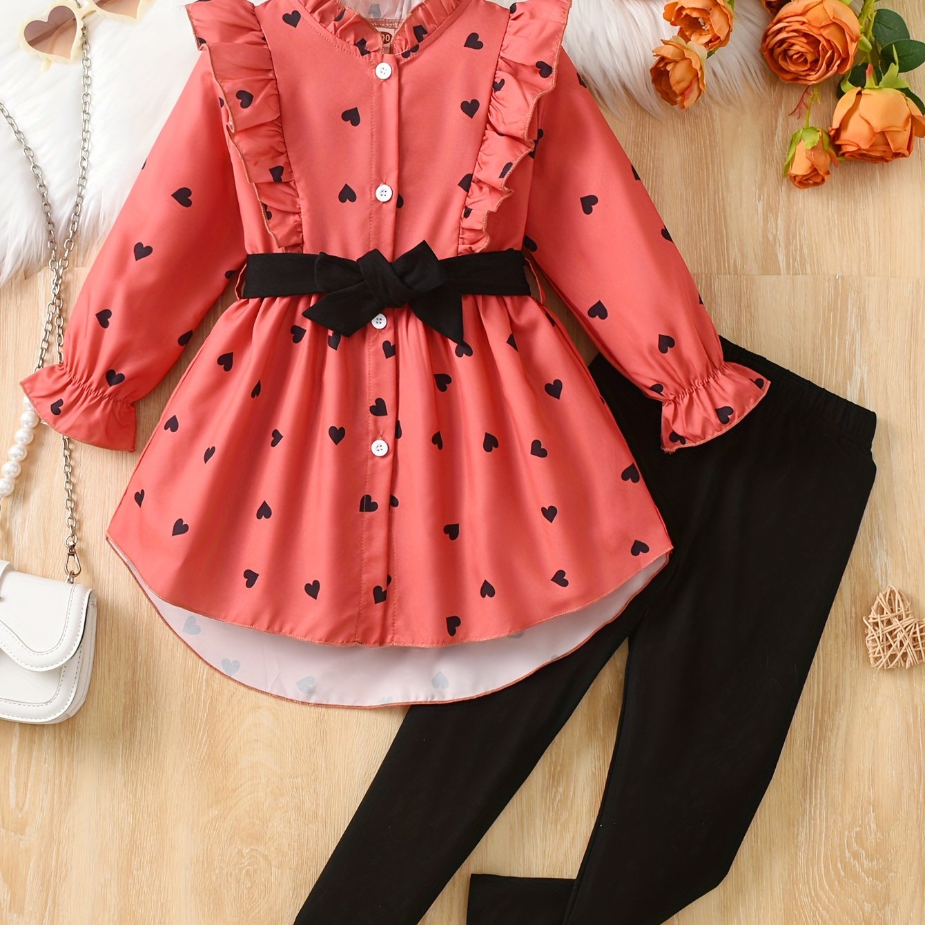 TEMU Girls' Casual Suit, Heart Print With Lotus Le...