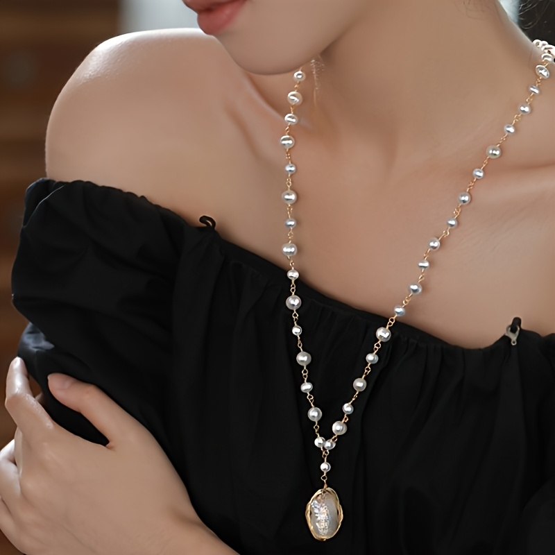 TEMU Elegant Women's Baroque Pearl Long Necklace -...