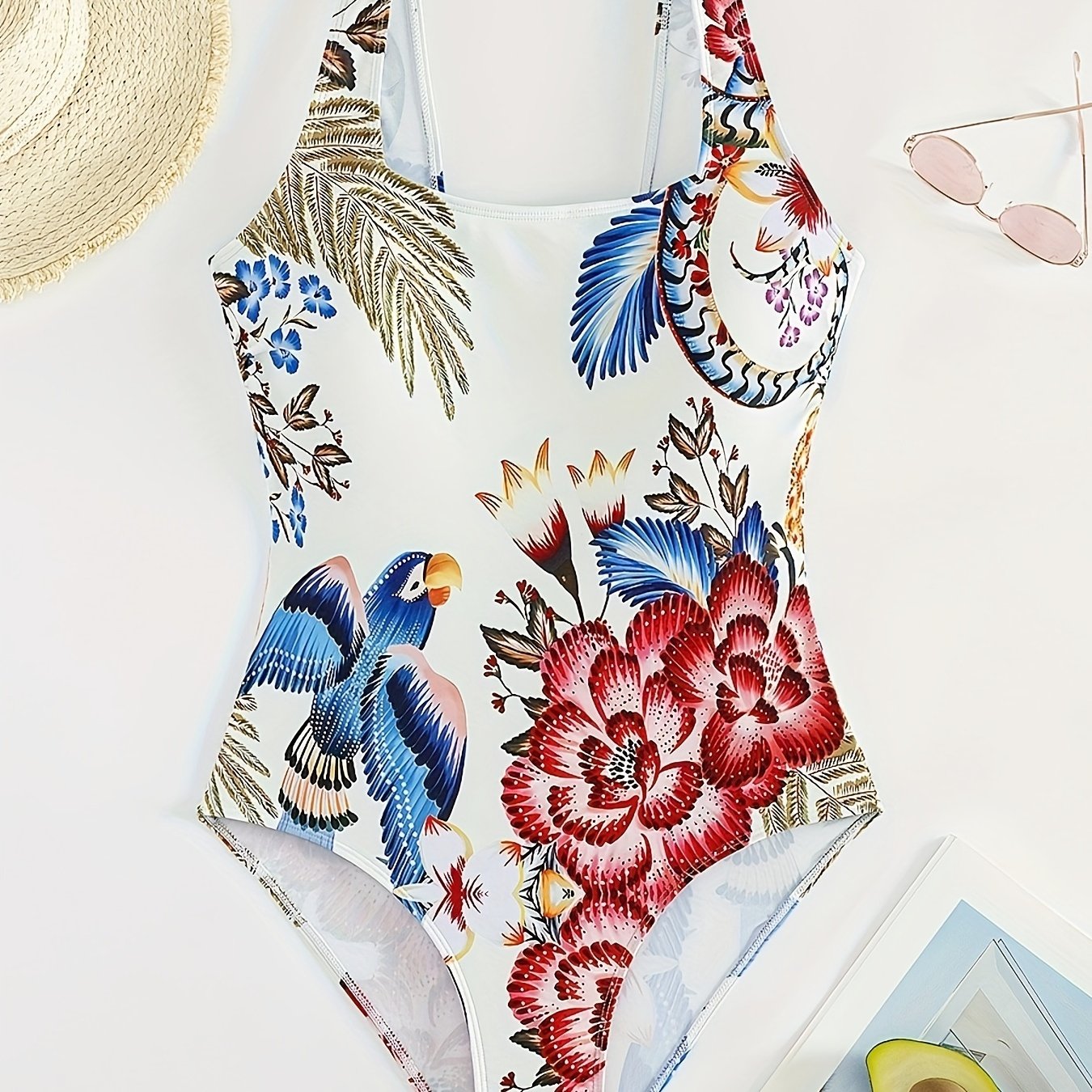 TEMU Plus Size Bird Floral Print Backless One-piec...