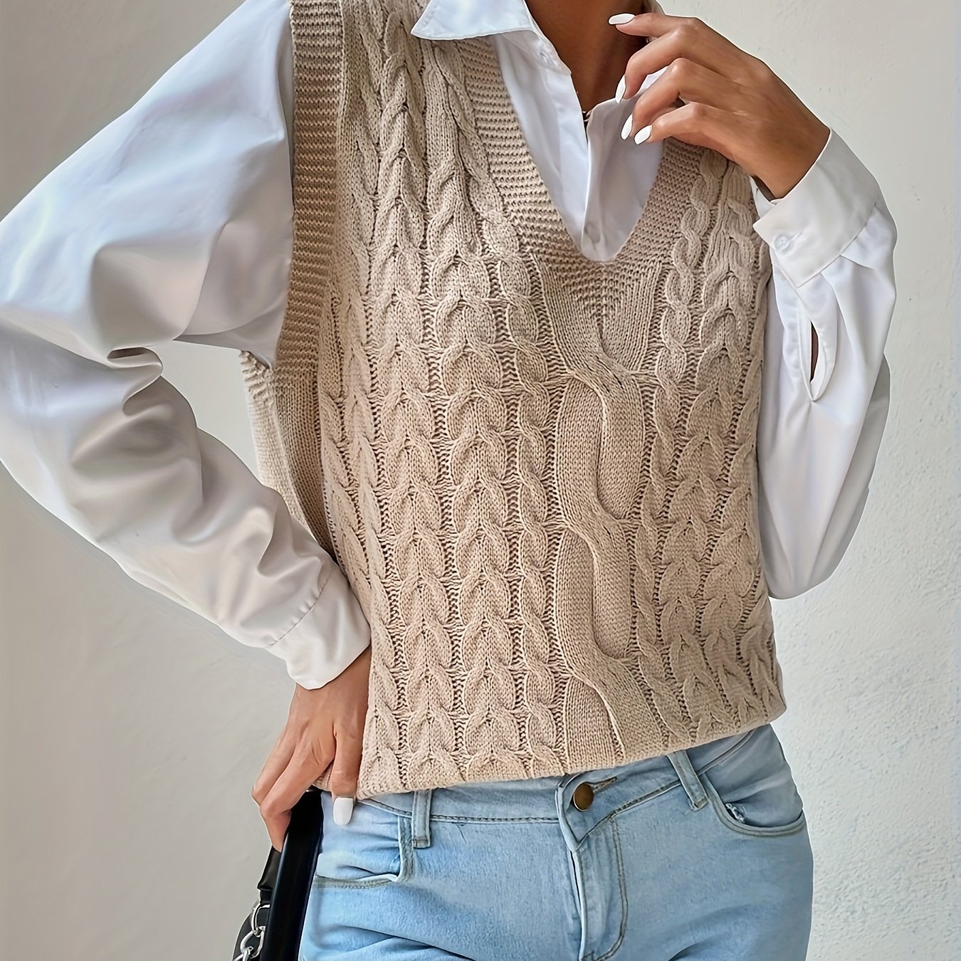 TEMU Plain V-neck Cable Knit Sweater, Elegant Long...
