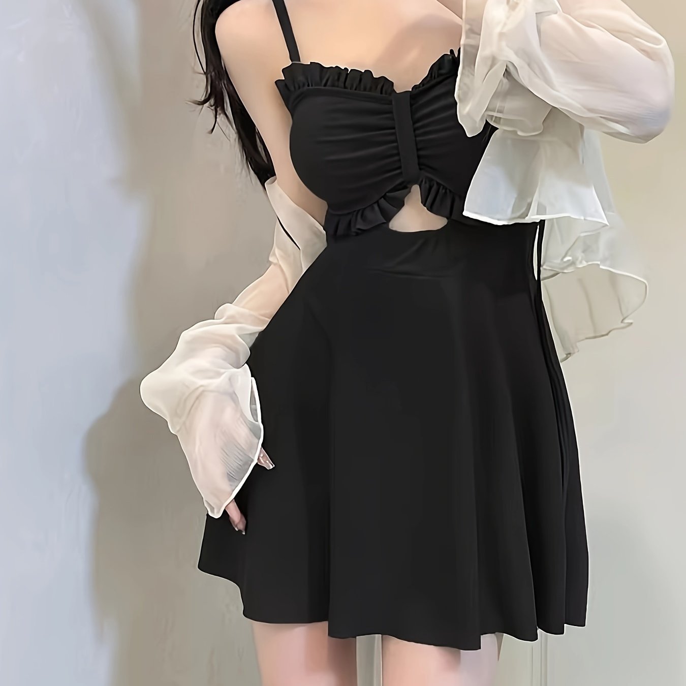 TEMU 無地フリルハローアウトワンピーススイムスーツ、フリル袖カーディガン、2枚セット中伸縮性のあ...