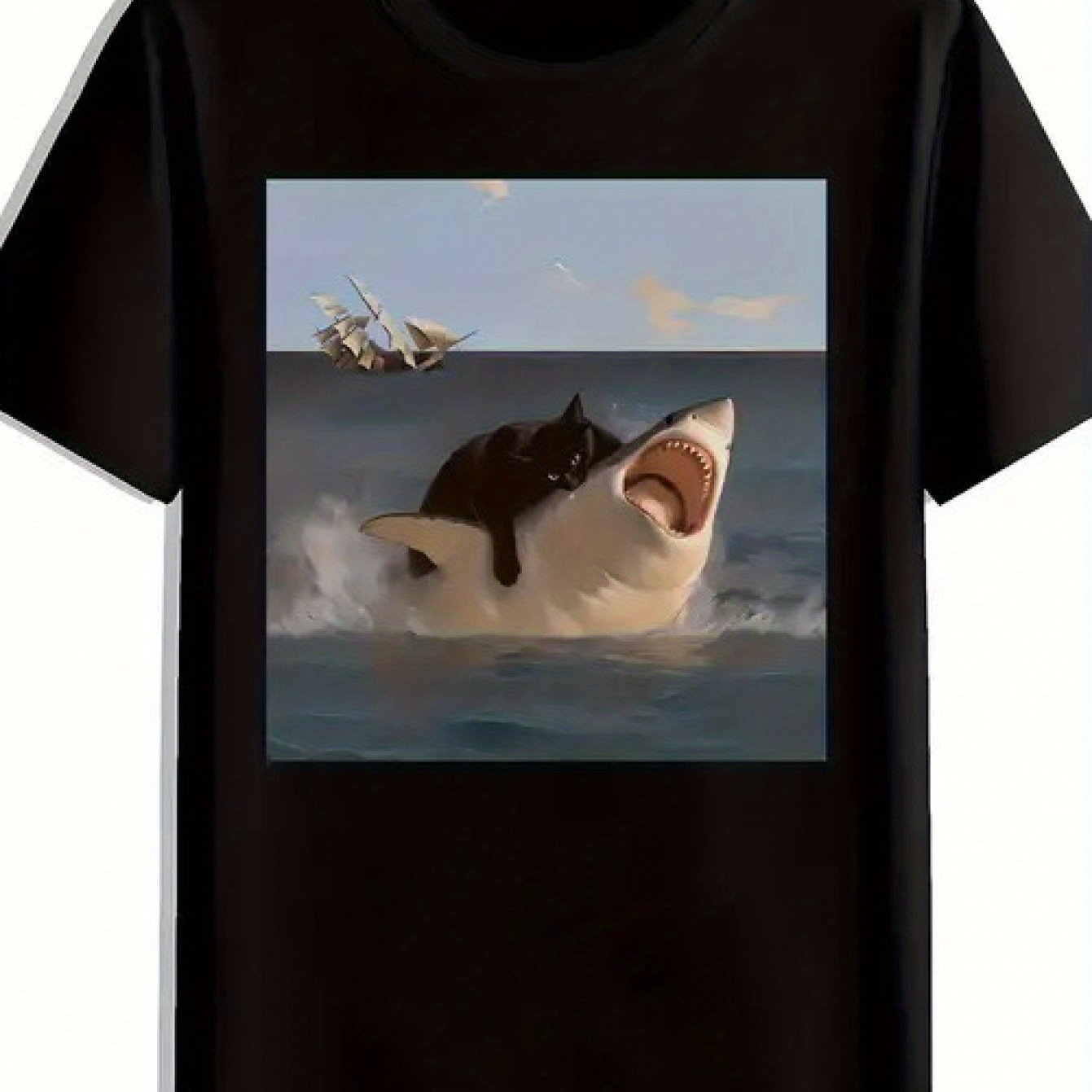 TEMU Men's Funny Shark & Black Cat Graphic Tee - C...