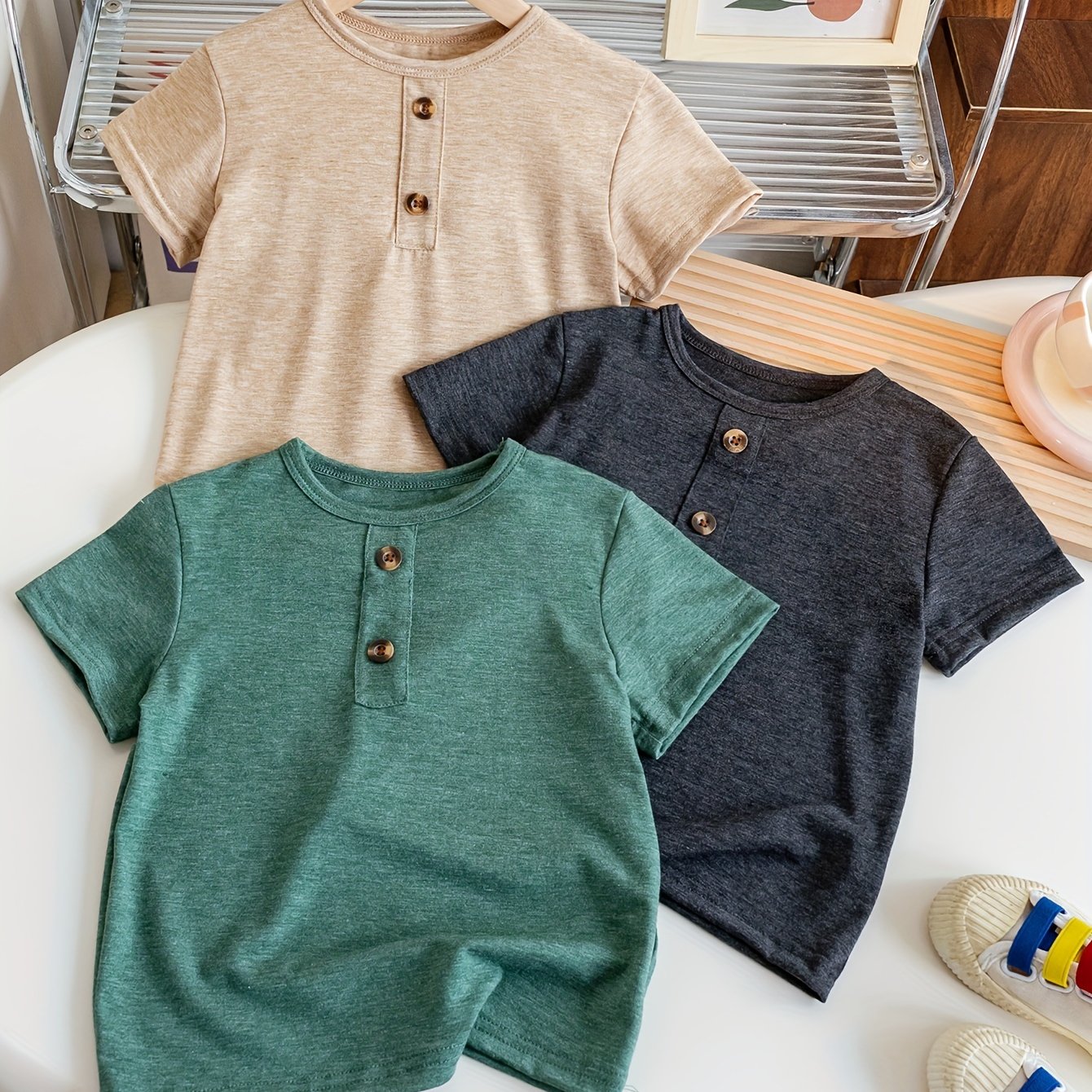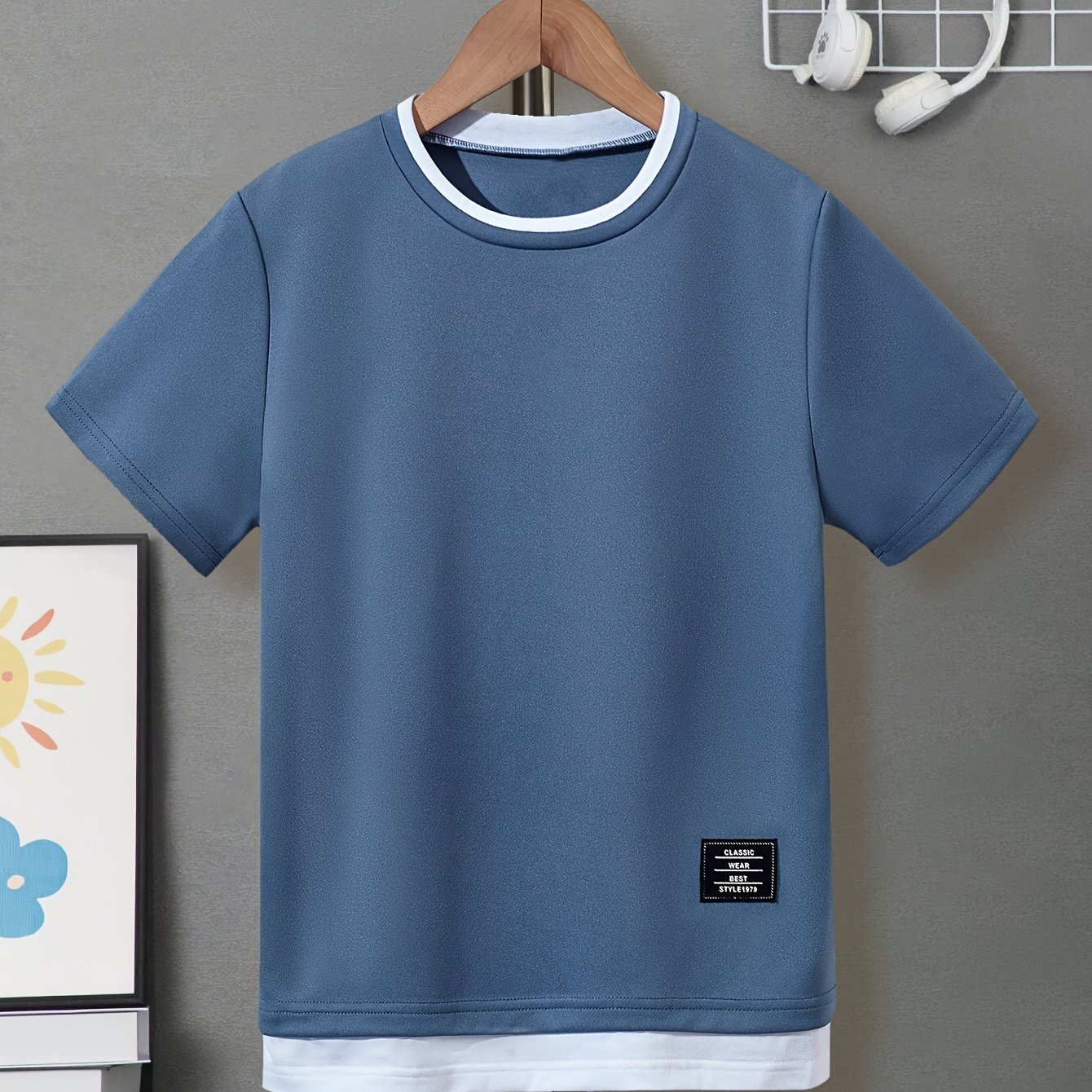 TEMU Boys' Summer Trendy Double-fold Round Neck Sh...