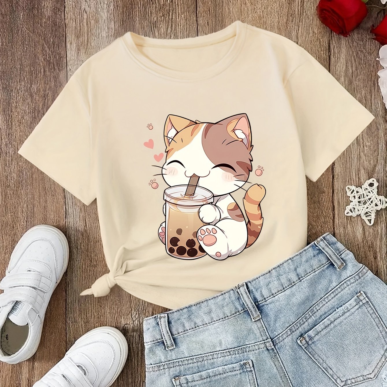 TEMU Girl's Cute Cat And Bubble Tea Print T-shirt,...