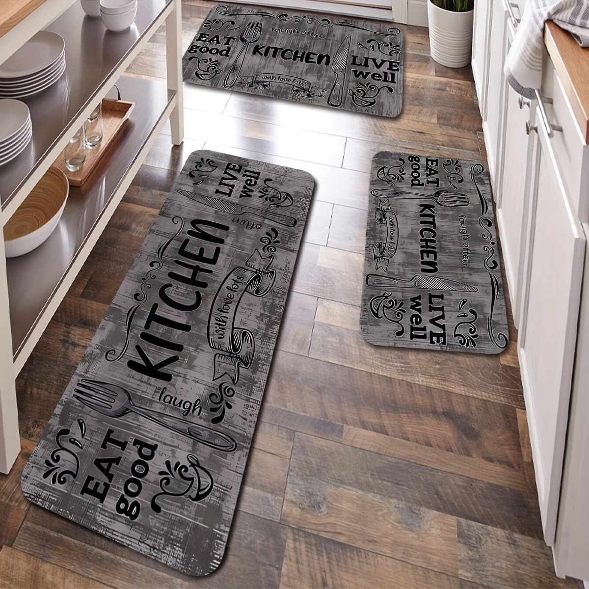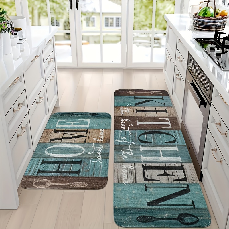 Product information for TEMU 1pc Kitchen Mat With Food & Letter Design – Anti-slip, Machine Washable Polyester Floor Mat With Pvc Backing, Cooking & Dining Areas, Kitchen Floor Mat