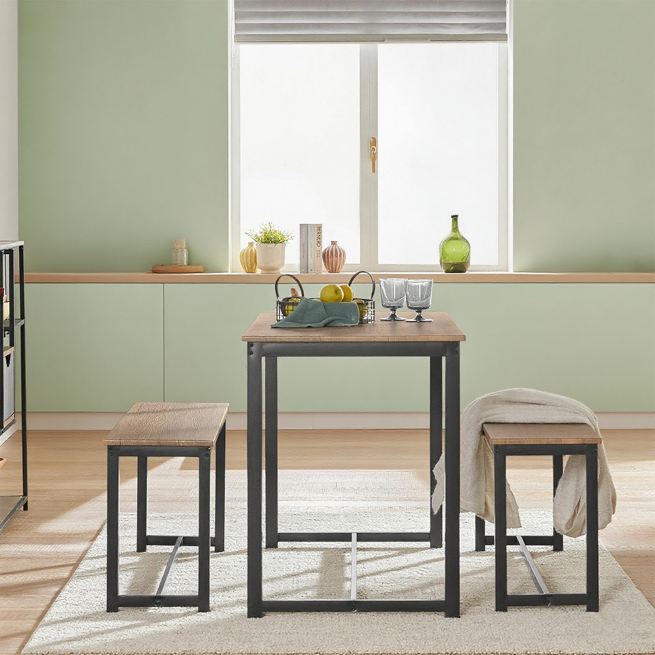 Homely Elegance - This wood-grain farmhouse dining table and bench combine clean lines and warm charm, perfect for homes, apartments, or cozy cafés. Seats 4-6 People - kitchen table with benches chic design makes this 3-piece set perfect for any occasion. With a 47-inch table, it comfortably accommodates 4-6 people, perfect for cosy dining. Sturdy Structure - This MDF dining set is reinforced with a metal structure for stability and strong weight capacity (Table: 330lb; Chair: 450lb). Its anti-slip foot pads prevent floor scratches. Versatile Use - Ideal for commercial settings or home use, its space-saving design makes it perfect for dining, working, studying or leisure activities. This set can serve as a dining table, computer desk, study area or breakfast nook. Easy Assembly & Maintenance - The set includes all necessary hardware and detailed installation manual for easy 45-minute assembly. The splash-proof surface is waterproof and scratch-resistant, offering effortless clean-up after every use. Table dimensions: 47.24"L x 31.5"W x 29.92"H Benches dimensions: 47.24"Lx13.78"Wx18.11"H Material: Engineered Wood+Metal Frame Manual: click here