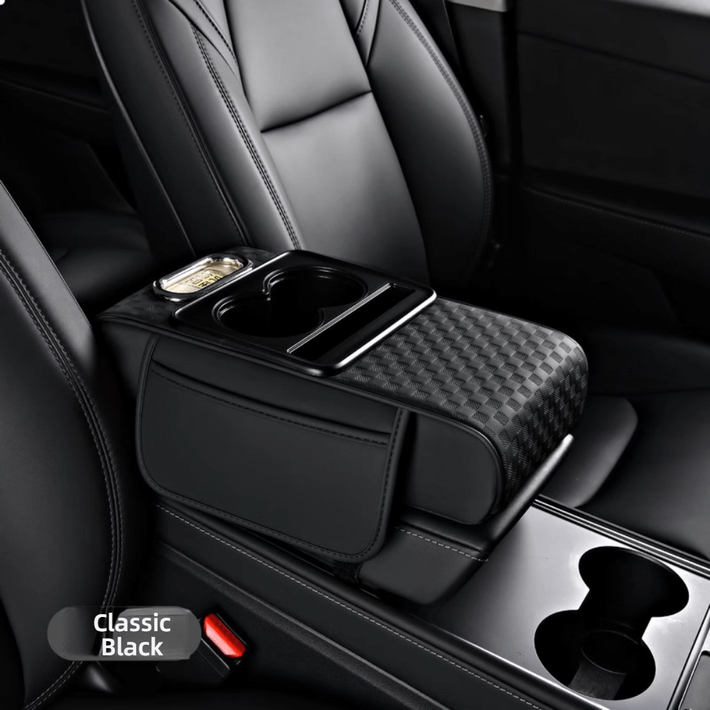 TEMU Car Armrest Pad With Cup Holder & Multi-functional Storage Box For Tissues - Durable Leather, , Universal Vehicles, Vehicle Accessory, Sleek Accessory, Textured Finish