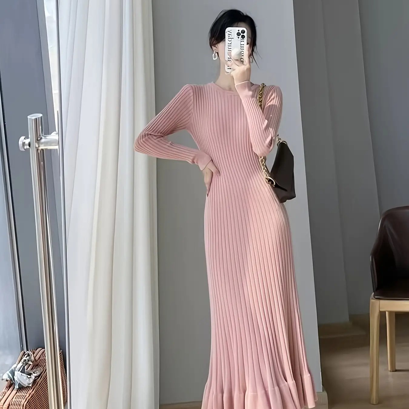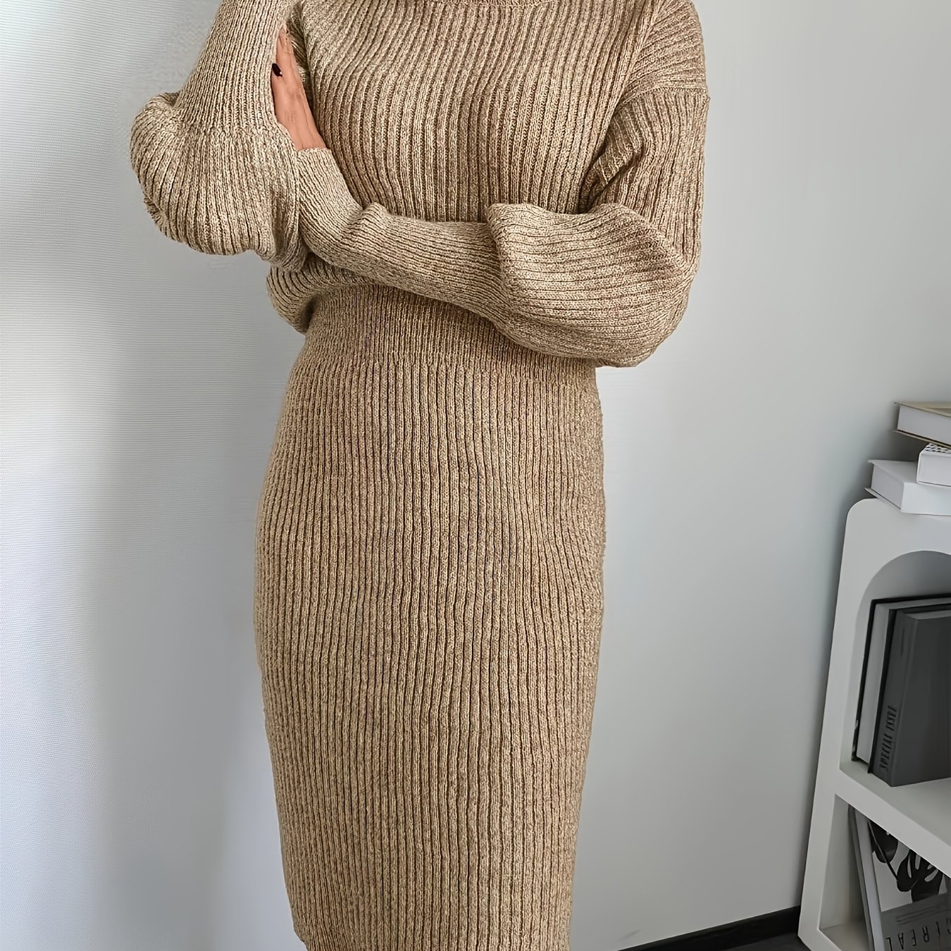 TEMU Christmas Geo Pattern Flared Slim Knitted Dress, Elegant Long Sleeve Crew Neck Mini Dress For Fall & Winter, Women's Clothing