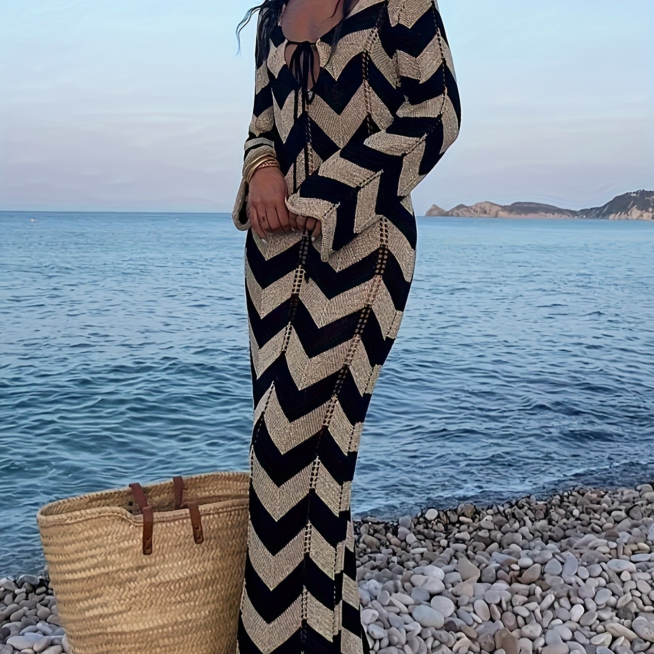 TEMU Elegant Pink V-neck Crochet Sweater Dress - Sleeveless, Ribbed, Knee-length With Belt Detail, Spring & Fall, Women's Fashion, Crochet Dress