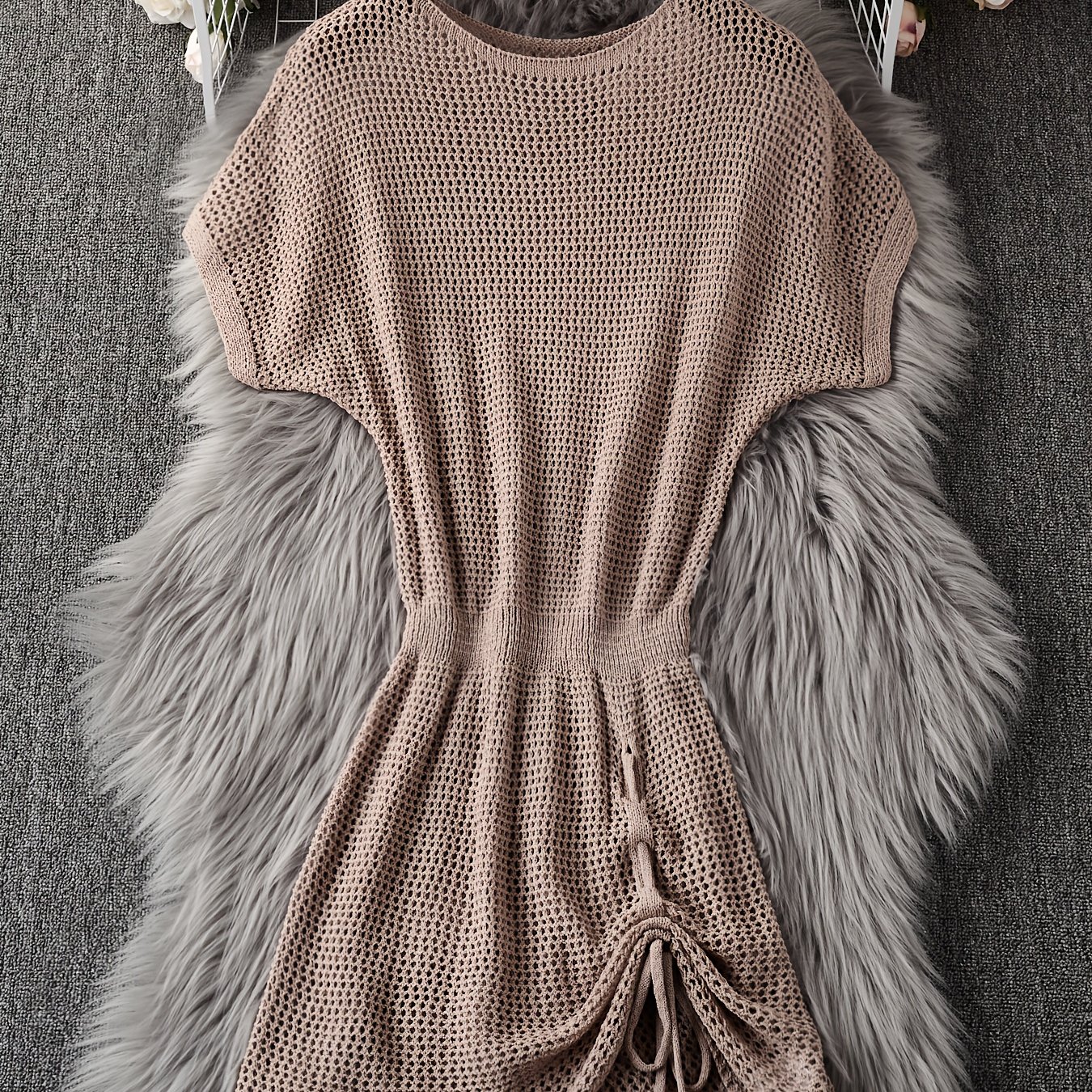 Product information for TEMU Elegant Pink V-neck Crochet Sweater Dress - Sleeveless, Ribbed, Knee-length With Belt Detail, Spring & Fall, Women's Fashion, Crochet Dress