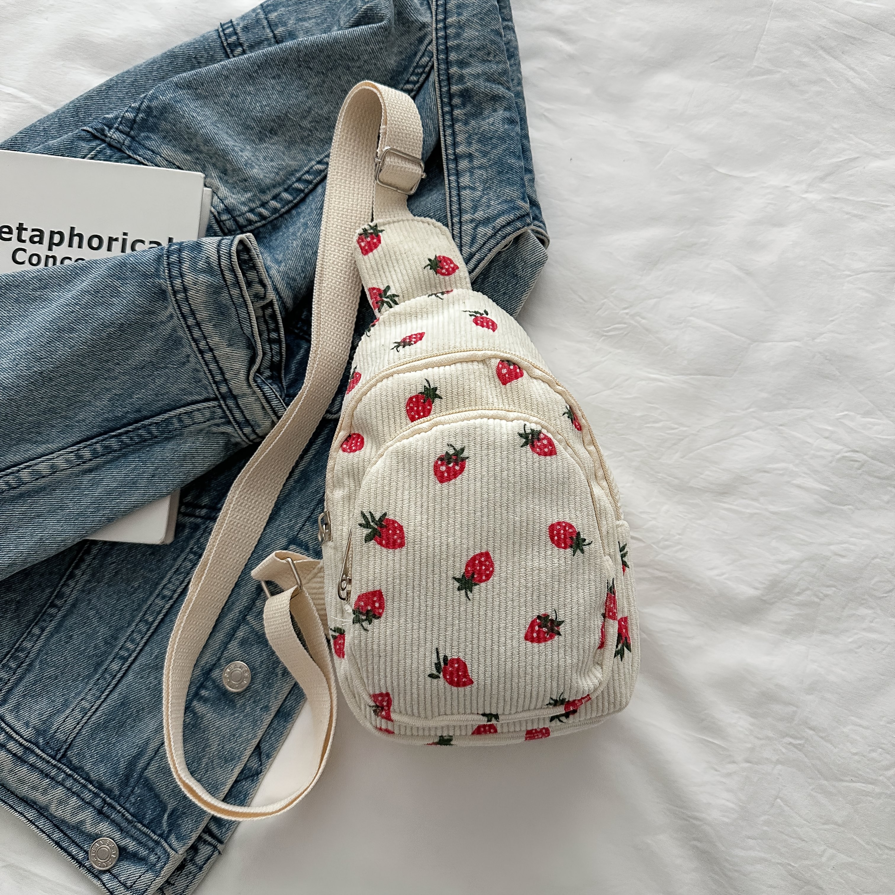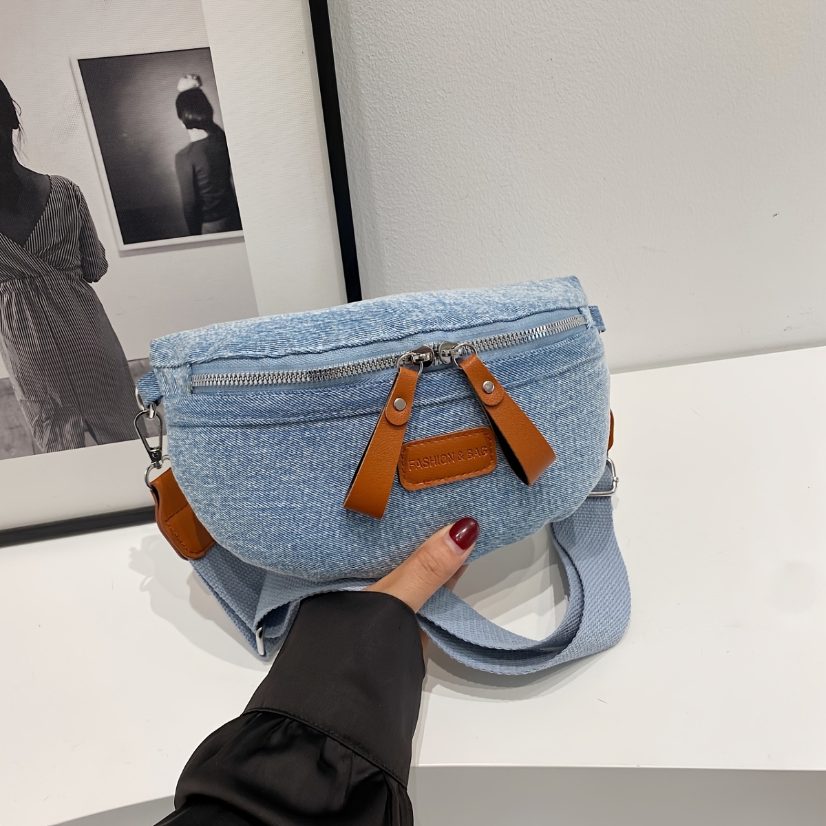 TEMU Fashionable Light Blue Denim Belt Bag For Women, Casual Chest Bag With Multiple Pockets, Adjustable Strap, Zipper Closure, Nylon Lined, Solid Color, Cowboy Style, Suitable For Shopping And Travel