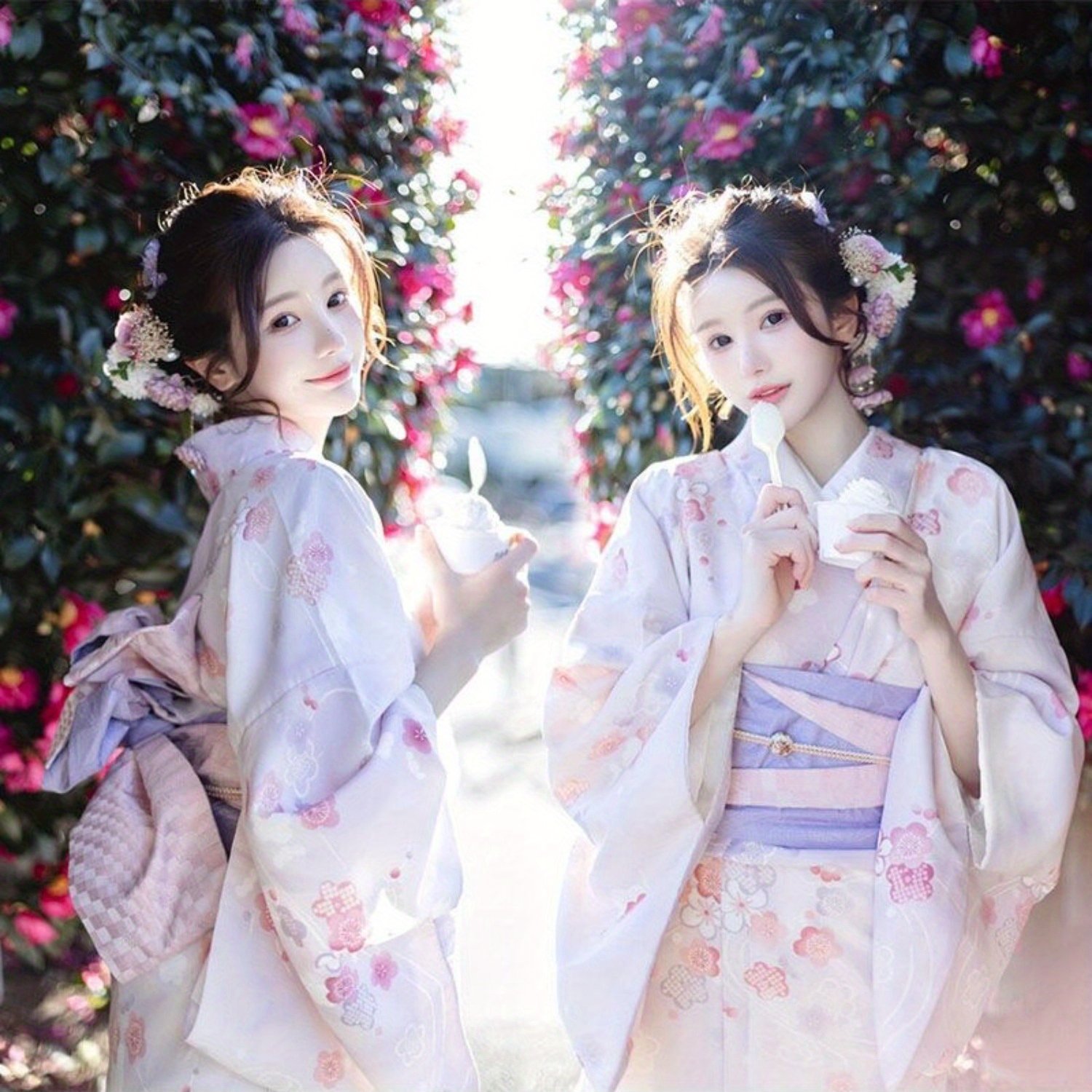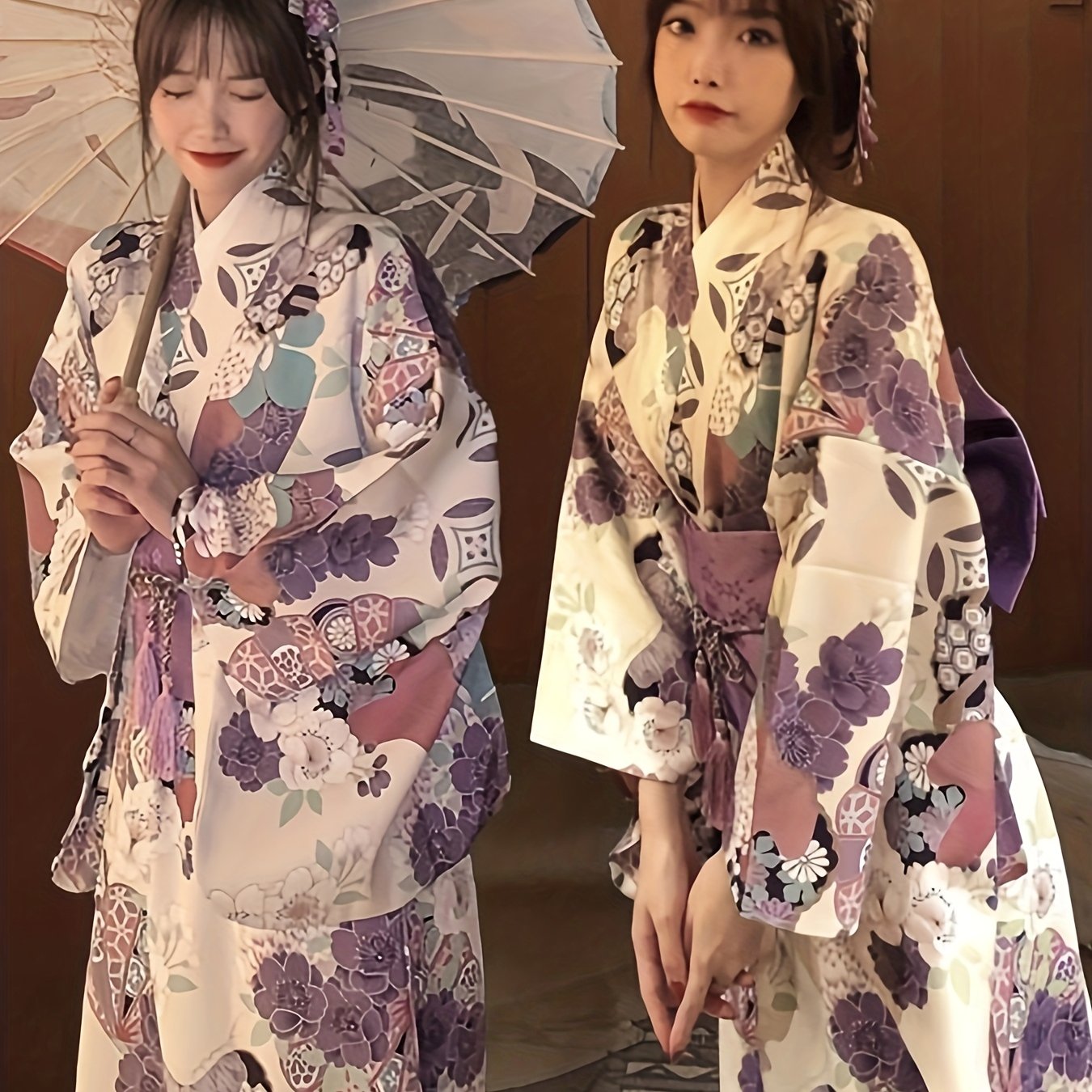 Product information for TEMU Floral Print Wrap Belt Kimono, Japanese Traditional Long Sleeve Mid Calf Kimono, Women's Clothing