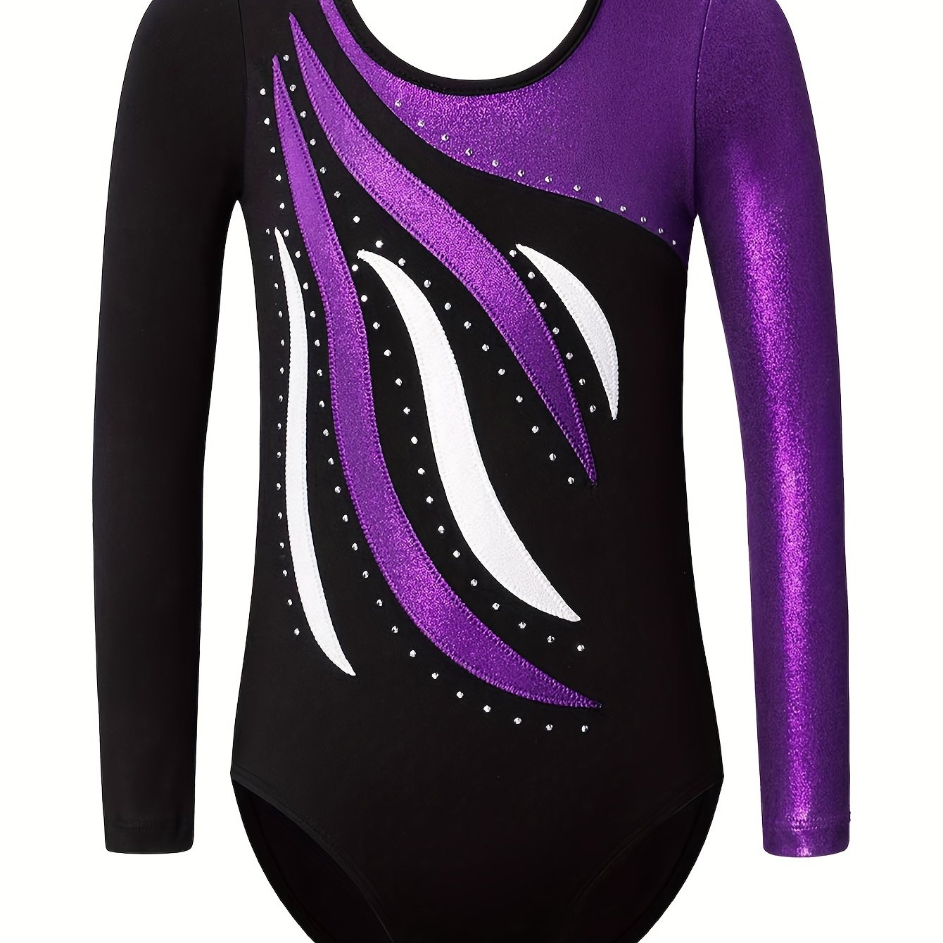 TEMU Girls' Sparkling Rhinestone Gymnastics Leotard - Long Sleeve, Stretchy & Breathable Dance Bodysuit For Performances And Practice, Outdoor