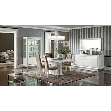 Dama Bianca 5-Piece Dining Room Set in White High Gloss Introducing the exquisite Dama Bianca Dining Room Set a true embodiment of modern elegance and sophistication. With its stunning details and lustrous white glossy finish this set is designed to enhance your dining space with a touch of contemporary allure. The Dama Bianca Set boasts graceful lines that exude an air of modern crispness creating a harmonious and inviting atmosphere in your home. Central to this remarkable ensemble is the Dama Bianca Dining Table a masterpiece that seamlessly merges style and functionality. This table features an 18 long extension allowing you to effortlessly expand its size whenever the need arises. This versatility ensures that you can host both intimate dinners and larger gatherings with utmost ease. The sleek and glossy white finish of the table adds a sense of brightness and openness to your dining area while its modern design complements a wide range of interior aesthetics. Enhancing the set s allure are the Dama Bianca Side Chairs upholstered in premium eco-leather. These chairs not only offer comfort but also showcase a seamless blend of style and quality. The eco-leather upholstery adds a touch of luxury and refinement elevating your dining experience to new heights. The chairs design perfectly complements the table s aesthetic creating a unified and cohesive dining set. The Dama Bianca Dining Room Set is a testament to the art of contemporary design where every detail is meticulously crafted to create a harmonious and visually appealing composition. Whether you re hosting formal dinners or casual gatherings this set effortlessly adapts to any occasion ensuring that your dining experiences are truly exceptional. Elevate your dining space with the Dama Bianca Dining Room Set a true masterpiece that encapsulates modern style versatility and sophistication. Its stunning details white glossy finish and graceful lines are sure to captivate your senses and transform your dining area into a haven of elegance and comfort. Dimensions: • Dining Table: 79 -97 W x 41 D x 30 H • Side Chair: 19 W x 24 D x 42 H 5 Piece Package Deal Includes: Table 4 Side Chairs