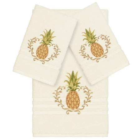 This authentic hotel and spa 3-piece towel set is made from plush high end Turkish cotton for supreme absorbency and durability. The beautiful cream towels are embellished with an embroidered pineapple design which traditionally symbolizes welcome and hospitality to add that special touch to your bathroom. Includes: One (1) bath towel and two (2) hand towels 100-percent soft and absorbent Turkish cotton Embellished with an embroidered design These luxurious towel are produced in a state of the art green factory in Turkey which runs on 100-percent solar energy Care instructions: Machine wash and dry Made in Turkey Dimensions: Bath towel - 27 inches wide x 54 inches long; Hand towel - 16 inches wide x 30 inches long
