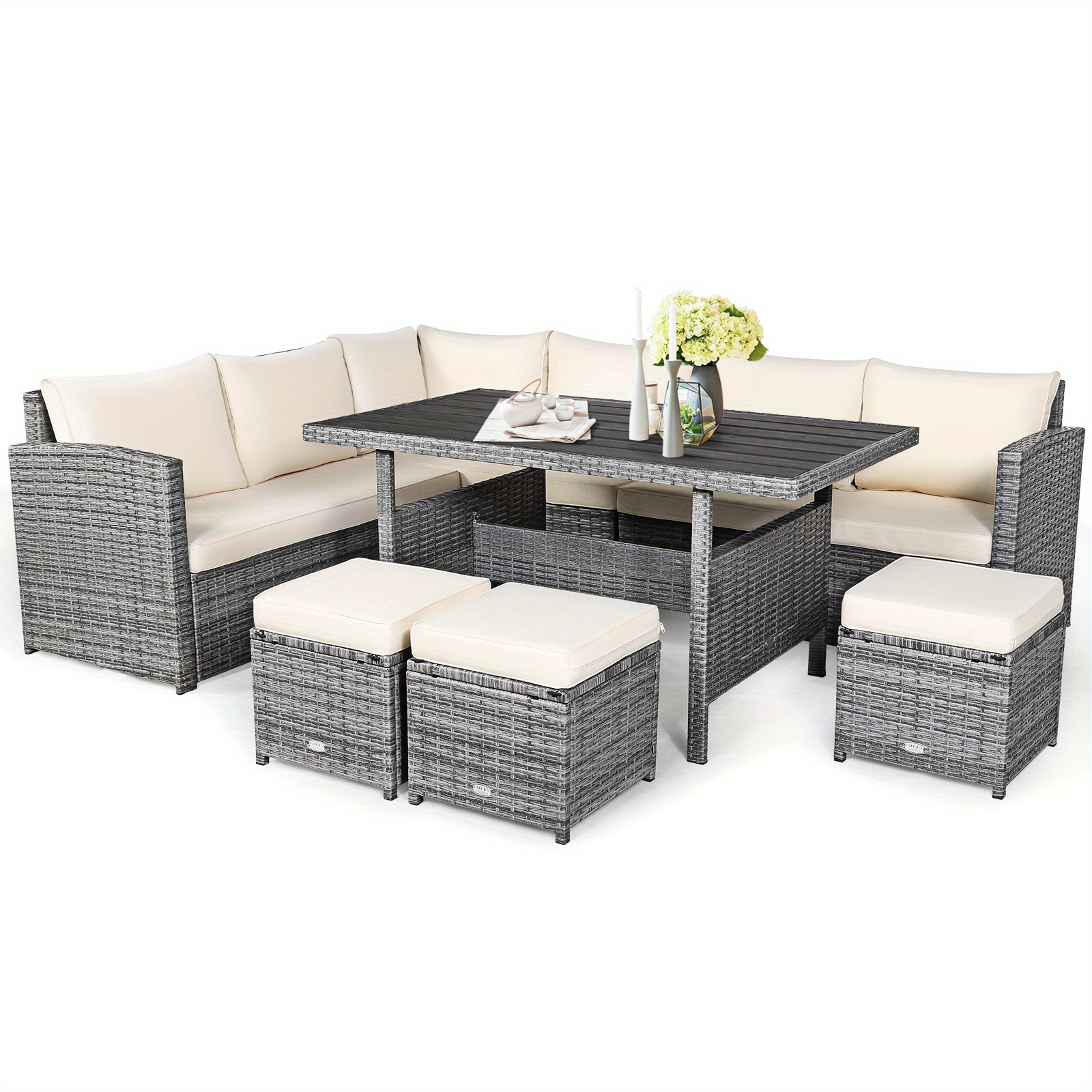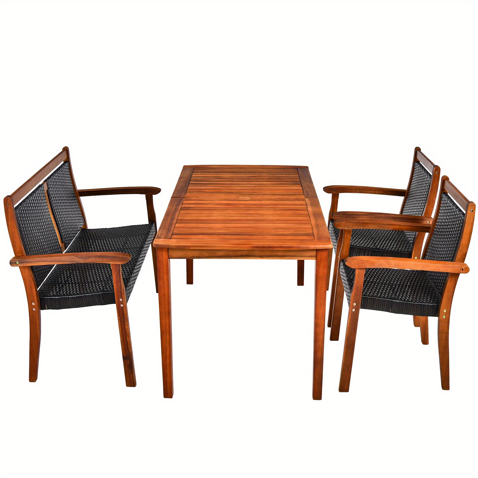 TEMU Lifezeal 7pcs Outdoor Wicker Dining Set, Patio Dining Furniture Set With Acacia Wood Table And 6 Armchairs, Outdoor Table And Chairs Set With 1.96" Umbrella Hole And Cushions.