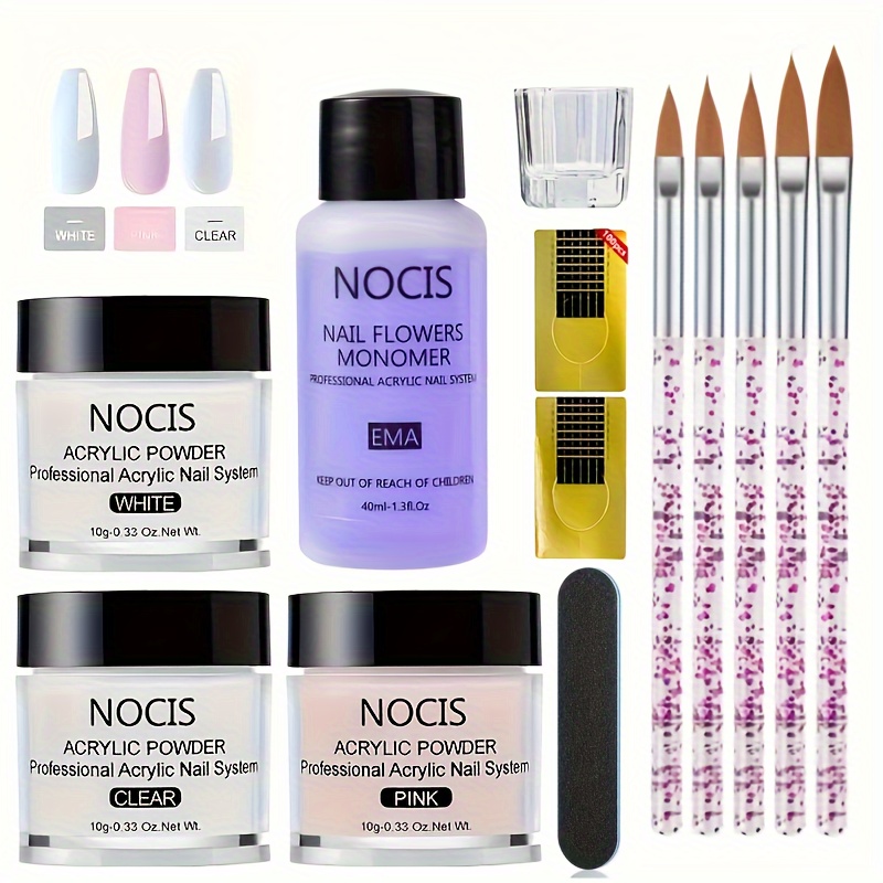Product information for TEMU Nocis Acrylic Nail Kit With Brushes, Monomer, Clear & Pink Acrylic Powder - Non Yellowing Formula, Unscented - Beginner Nail Art Set