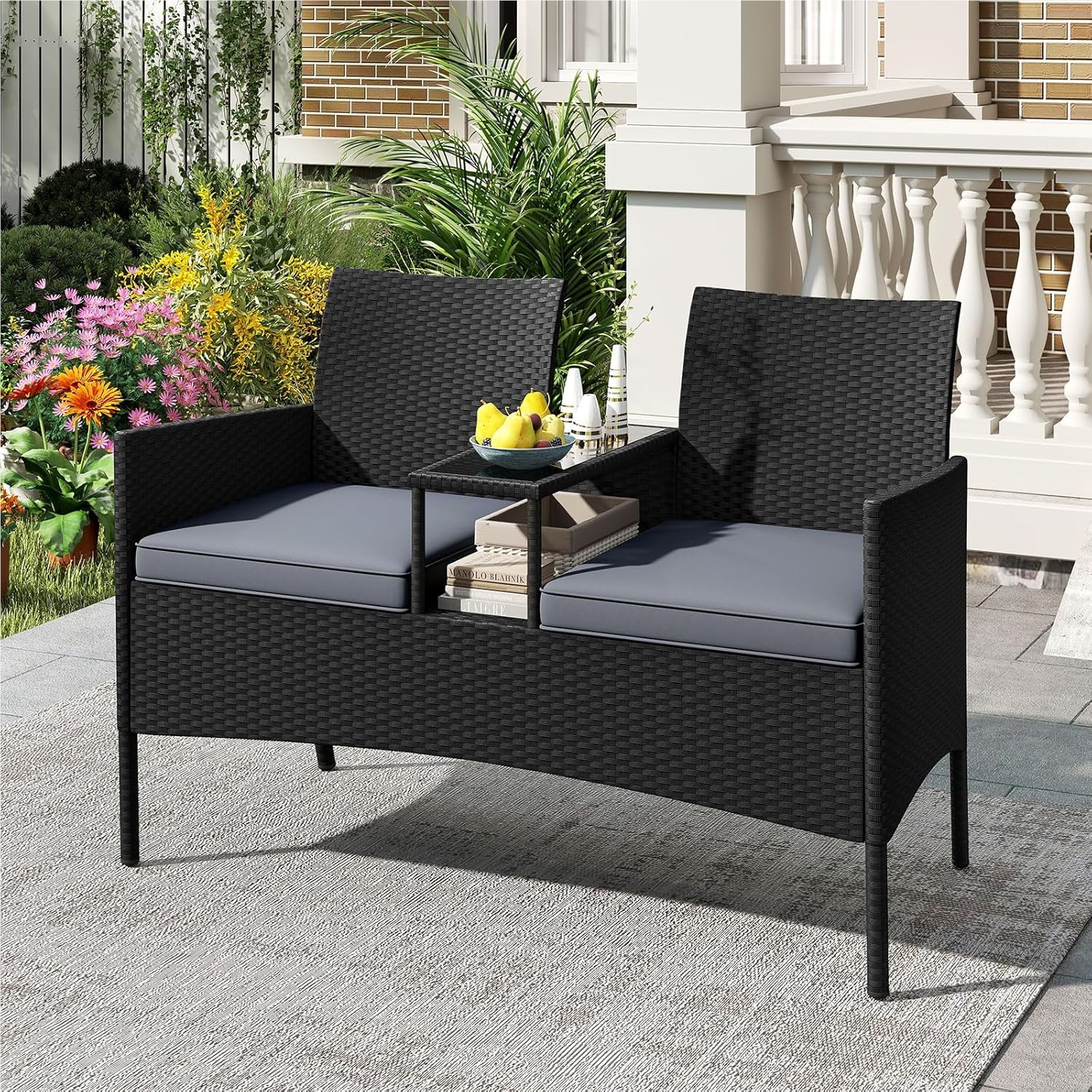 Product information for TEMU Patio Loveseat Set, Outdoor 2-seat Rattan Leisure Furniture With Storage Compartment, Soft Cushion For Home, Patio, Garden, Courtyard (light Blue) - Cy-out025