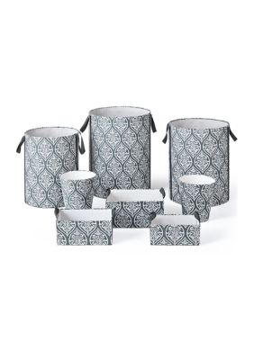These gorgeous floral storage pieces combine function and design in a stunning way. This collection will make sure all your rooms flow seamlessly with a graphite damask pattern in durable sailcloth. Each piece has a crisp white liner. The hampers and baskets have nylon handles for easy handling and portability from room to room. Enjoy three versatile sizes of round hampers perfect for any bedroom or laundry room. Three storage baskets with handles hide messy piles of toys or extra supplies in your home office. They look so pretty nobody will notice what is inside. Two tapered wastebaskets add a pop of grey in your bathroom to tie it all together. Each piece is perfect for a home storage refresh. Large Hamper: 18" L x 18" W x 24" H Medium Hamper: 16.5" L x 16.5" W x 22" H Small Hamper: 15" L x 15" W x 20" H Waste Baskets: 9.5" L x 9.5" W x 10.5" H Large Rectangular Storage: 14" L x 10" W x 7" H Medium Rectangular Storage: 12.5" L x 8.5" W x 6" H Small Rectangular Storage: 11" L x 7" W x 5" H | Baum Fabric Storage and Hampers, Wastebasket