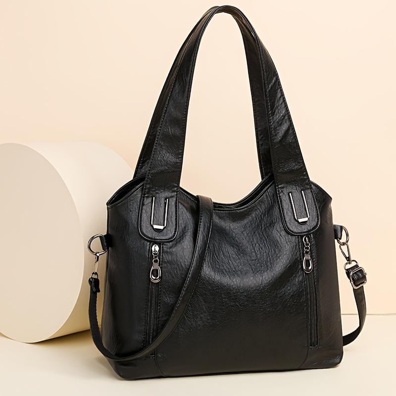 TEMU Vintage-inspired Large Capacity Leopard Print Tote Bag For Women - Chic Brown Pu Shoulder & With Zip Closure, Polyester Lining, And Fixed Straps - Ideal For Daily