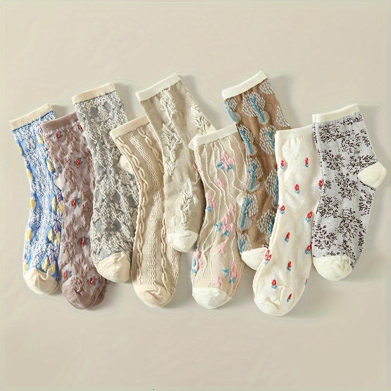 TEMU Women's Floral Embroidered Sheer Socks - 10 Pairs, Short Ankle Length, Polyester With Polyamide And Elastane, Machine Washable, Assorted Patterns - Spring/summer Collection