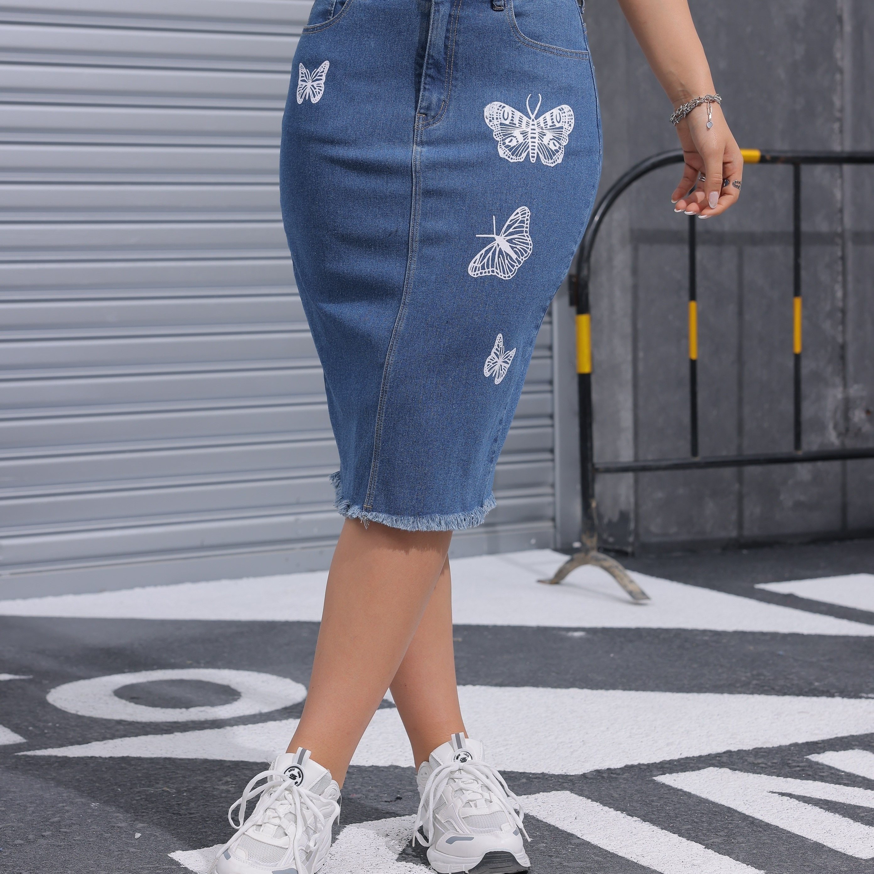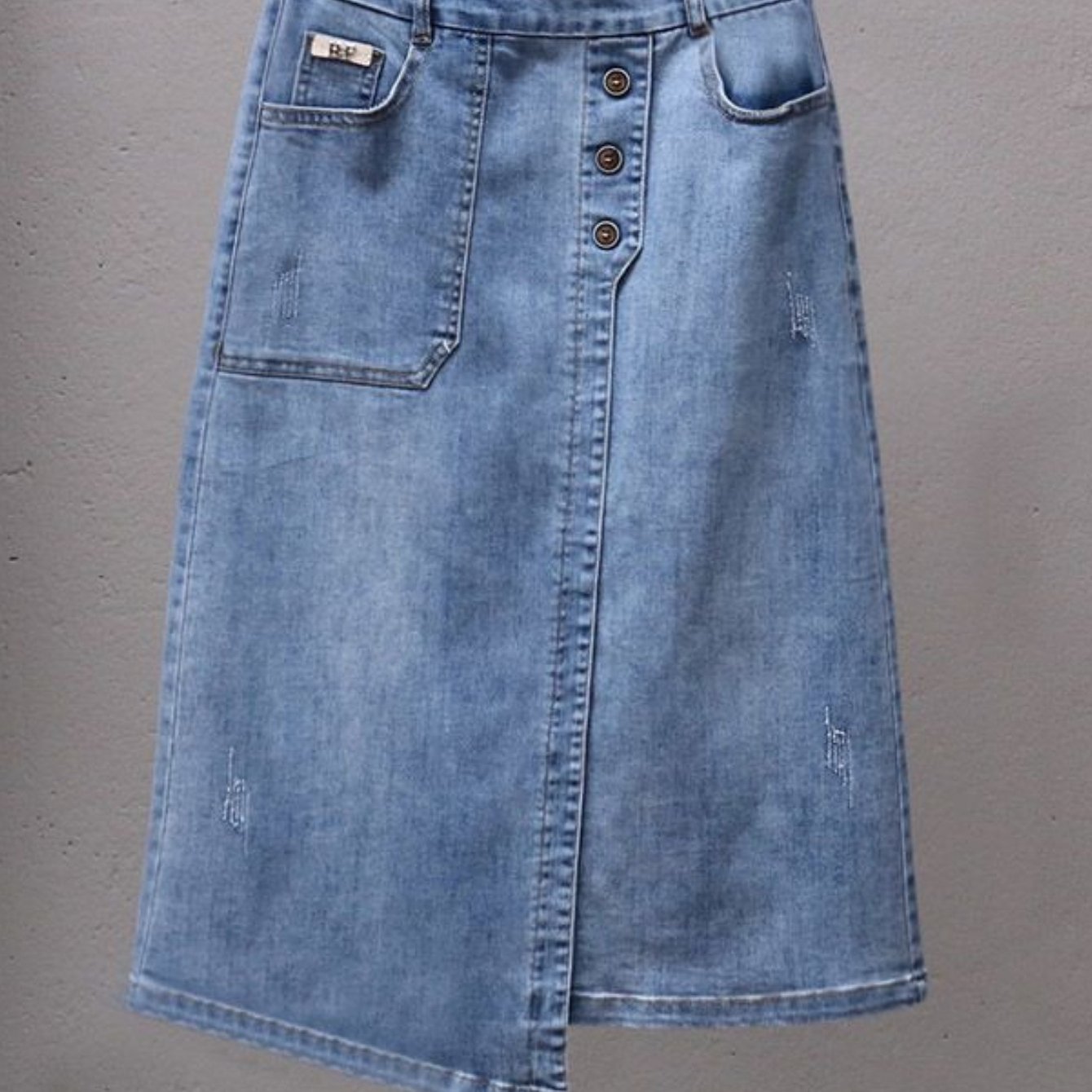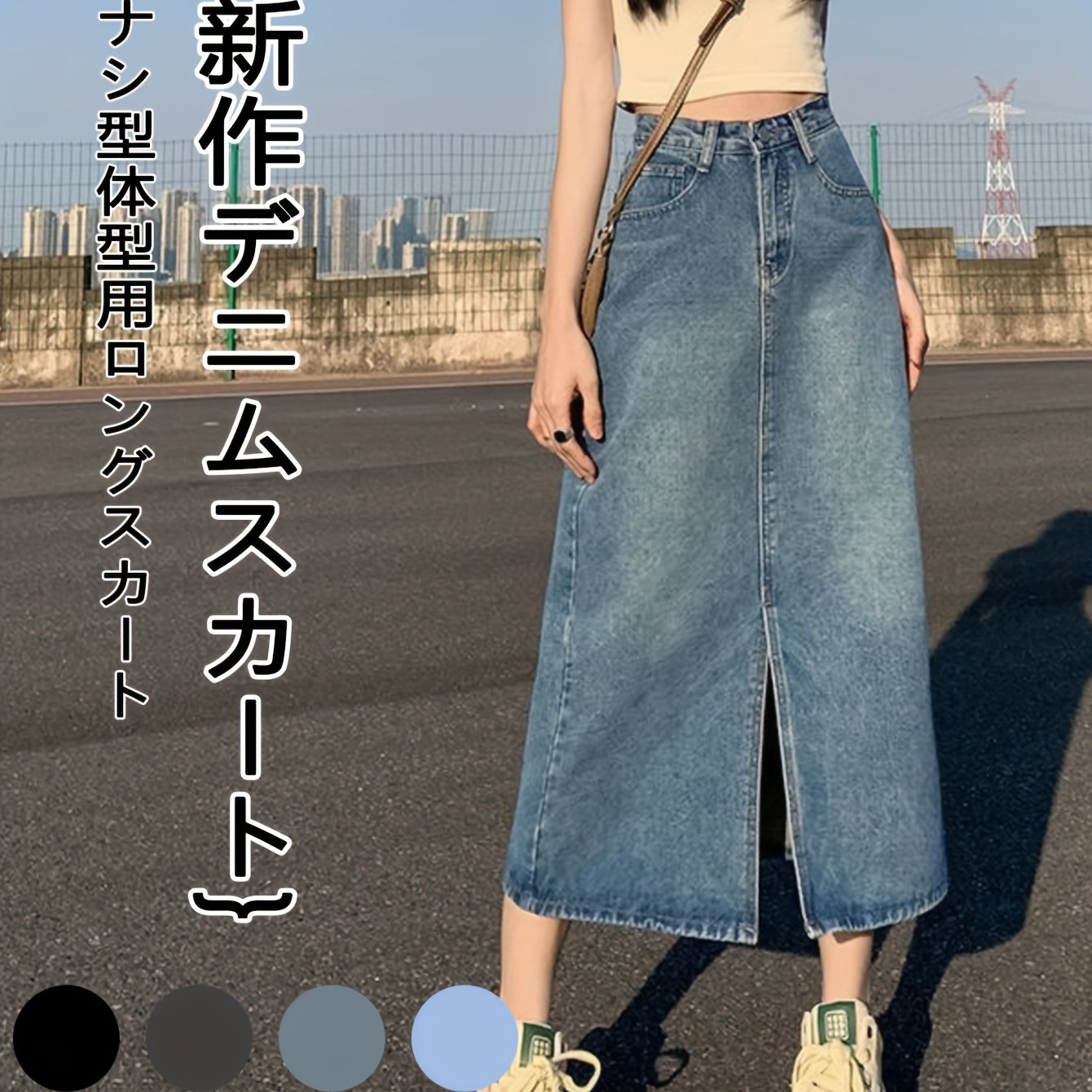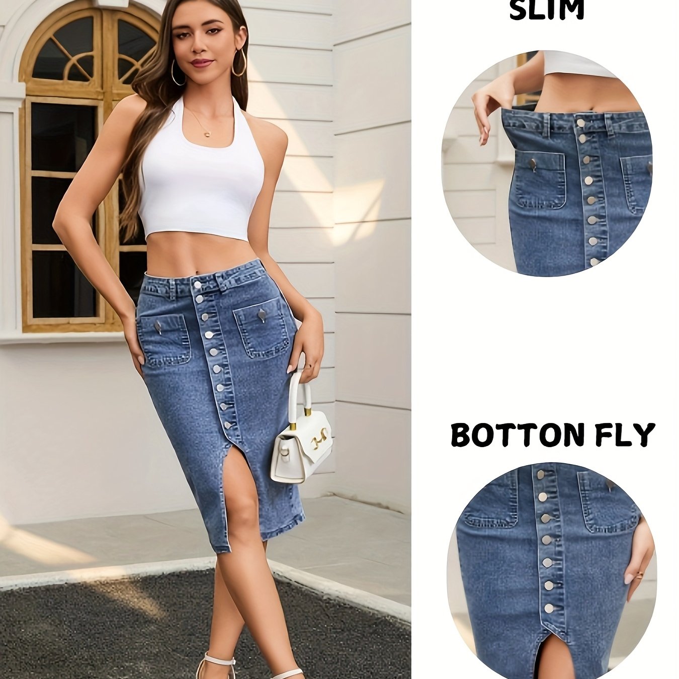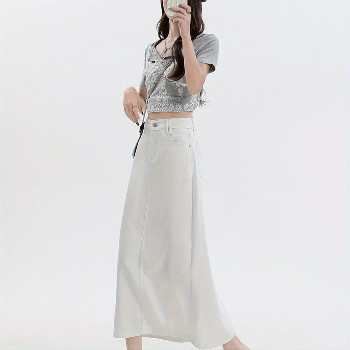 Product information for TEMU Women's Stretch Denim Midi Skirt With Front Zipper And Button Details - Casual High-waisted A-line Skirt For Spring/summer/fall, White Top And Sneakers, Casual Attire, Seasonal Fashion,