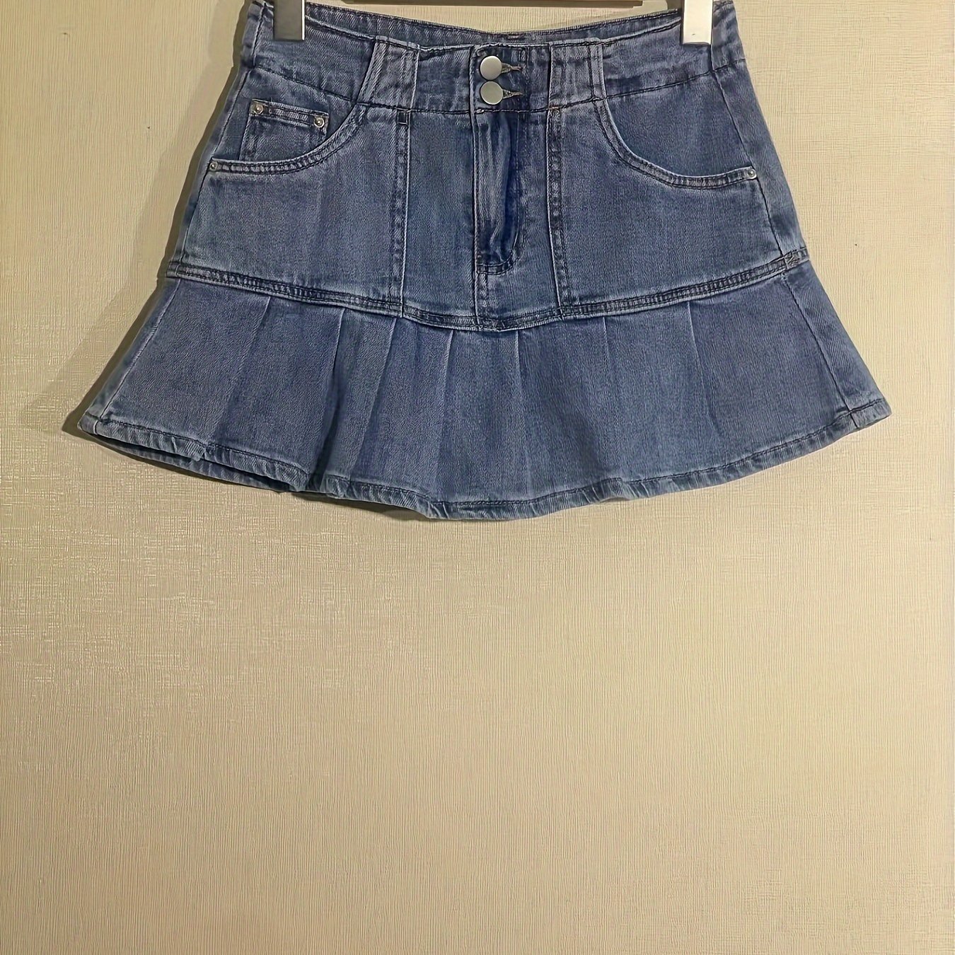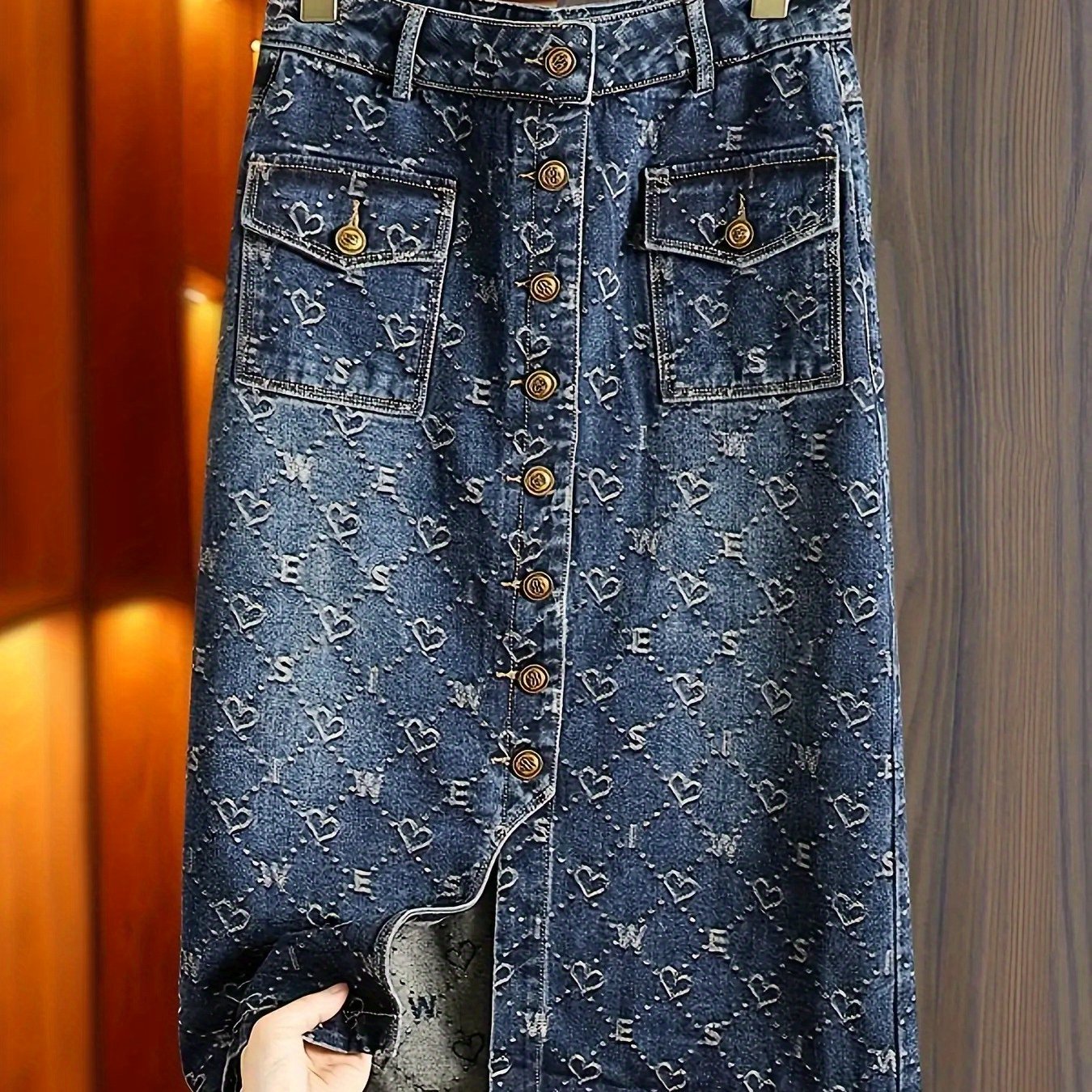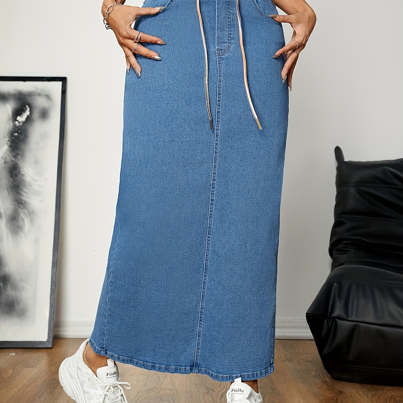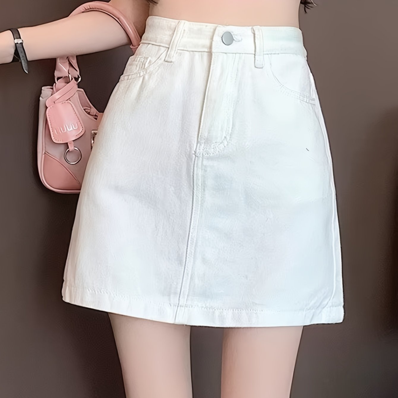 TEMU Women's Stretch Denim Midi Skirt With Front Zipper And Button Details - Casual High-waisted A-line Skirt For Spring/summer/fall, White Top And Sneakers, Casual Attire, Seasonal Fashion,