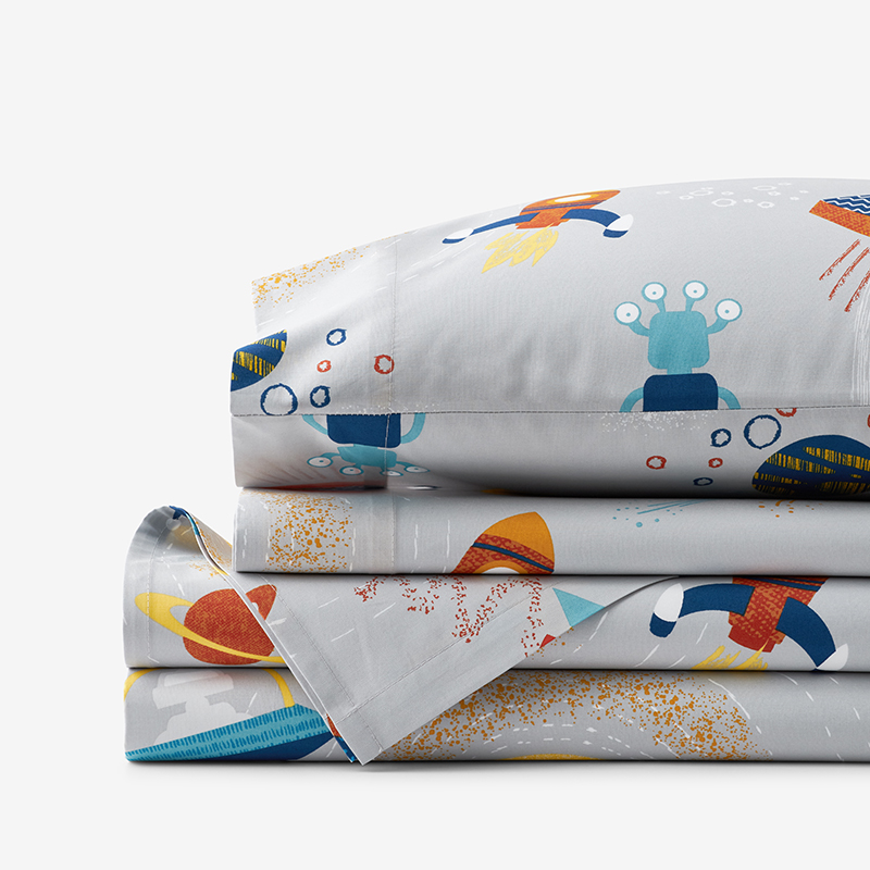 Sheet sets include Twin 1 Twin/Twin XL flat sheet, 1 Twin fitted sheet, and 1 Standard pillowcase Full 1 Full flat sheet, 1 Full fitted sheet, and 2 Standard pillowcases Queen 1 Queen flat sheet, 1 Queen fitted sheet, and 2 Standard pillowcases Showcasing a print of planets, stars, rockets, and UFOs, our colorful kids’ Space Organic Cotton Percale Sheet Set is just what every future astronaut needs. This eco-friendly collection is sewn of premium organic cotton percale for a cool, crisp finish. 200-thread count 100% GOTS certified organic combed cotton percale Fitted sheets accommodate mattresses of up to 14 in. deep Features an all-around elastic for ease of placement and less movement on the bed Additional pillowcases are sold in pairs OEKO-TEX® STANDARD 100 certification keeps you and your family safe from harmful substances (Certification number 22. HUS. 02907, Hohenstein HTTI) Certified to the Global Organic Textile Standard (GOTS) by Control Union 1008953 Imported | Space Classic Cool Organic Cotton Percale Sheet Set - Gray Multi, Queen - Gray, multi | The Company Store